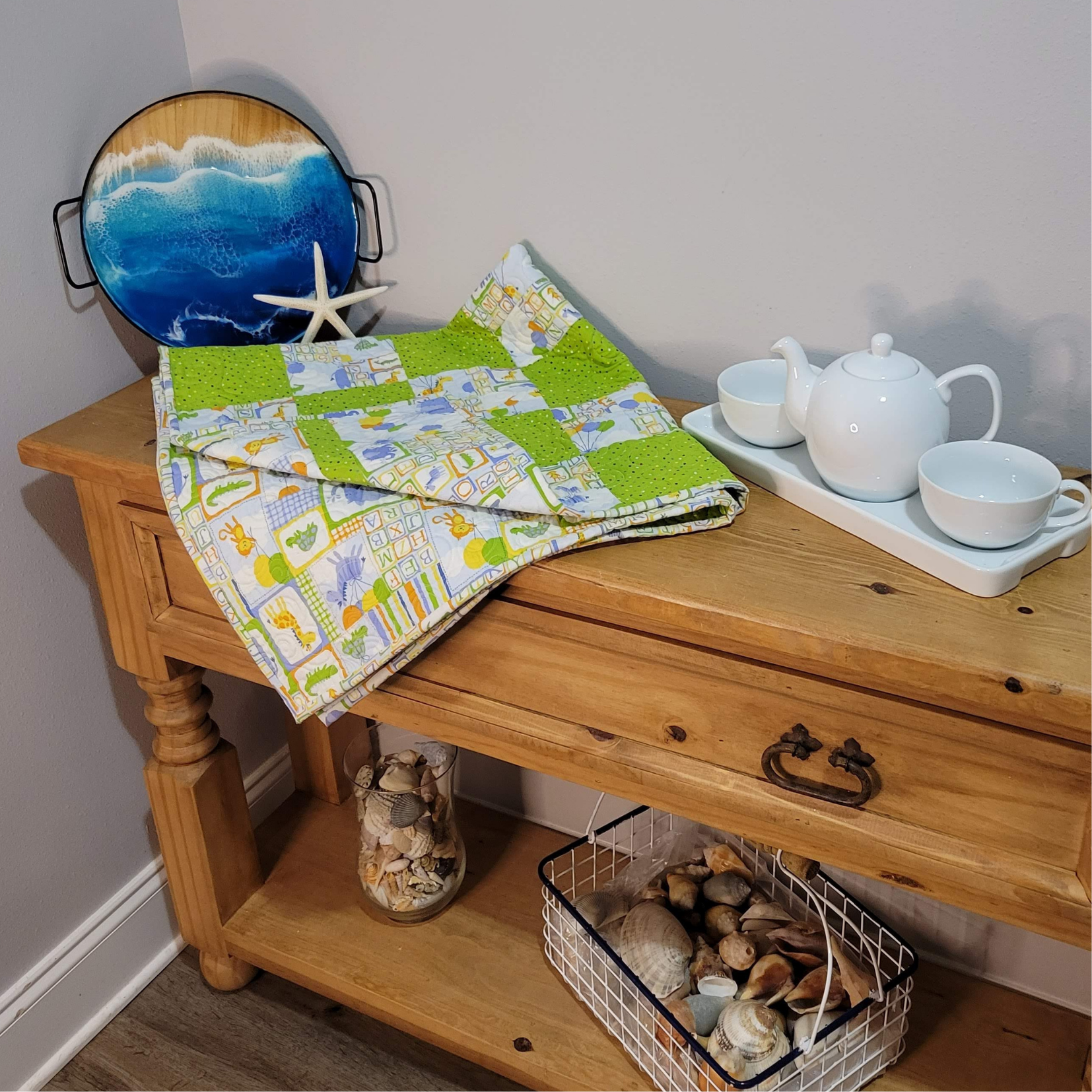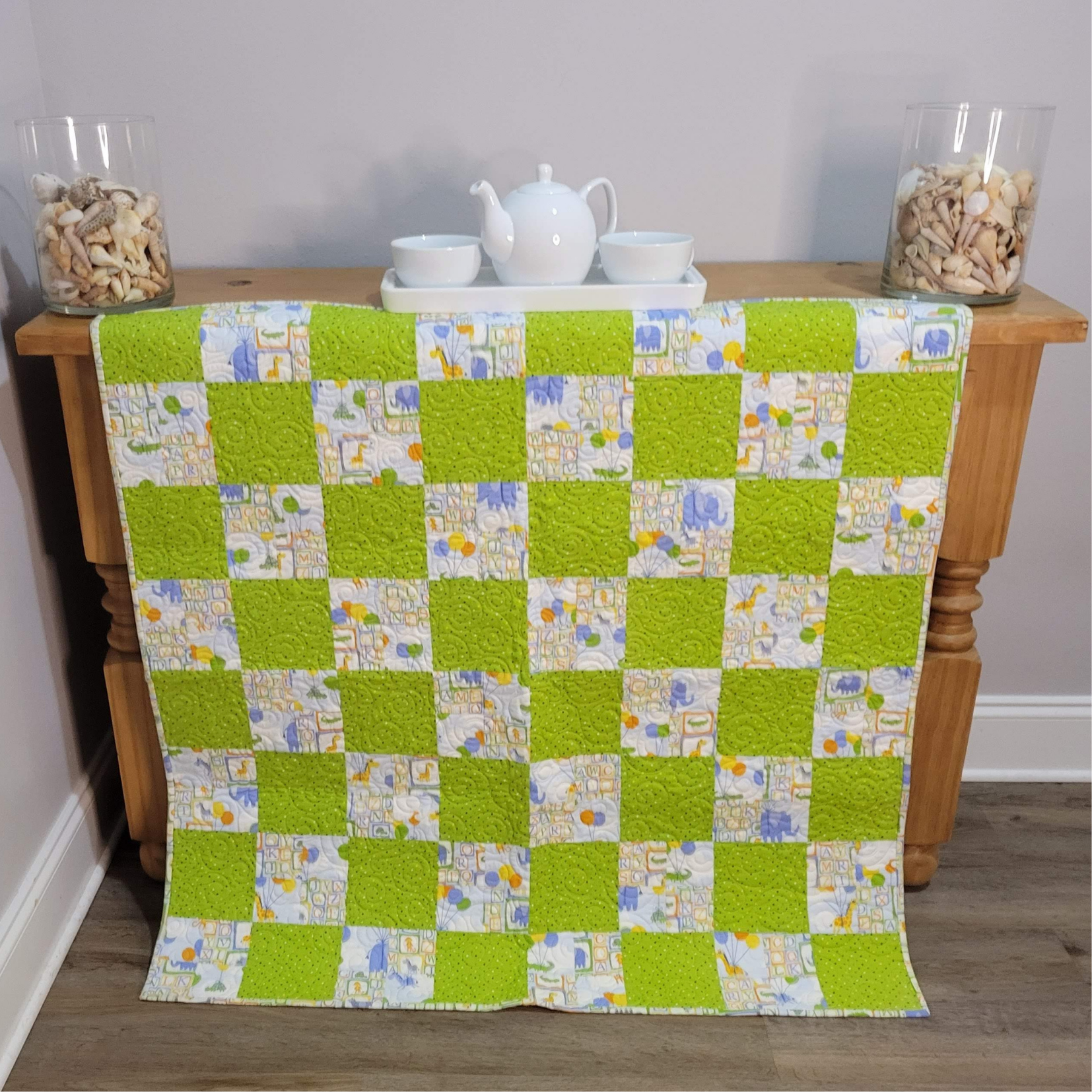 Are you looking for the perfect gift for that beautiful new addition to the family? Snuggle up those littles in this cute and fun print of little blue elephants and balloons prints. Blues, greens and yellows. Machine pieced and free motion machine quilted right here in my quilting studio with an edge to edge swirl design. Measures 38 inches square. All fabrics are excellent quality, 100% cotton and can be machine washed in cold and dried on low. They will soften with use and washing.