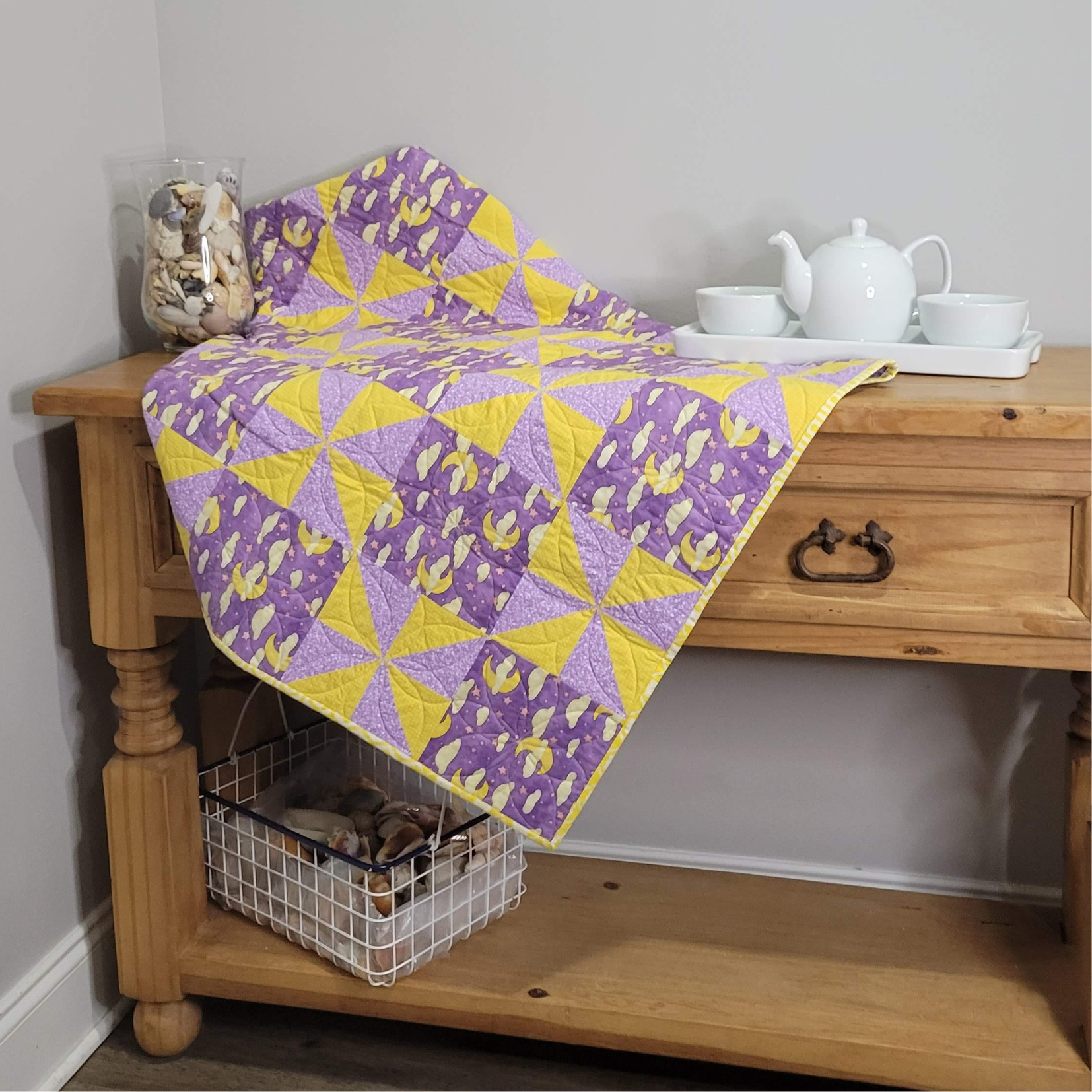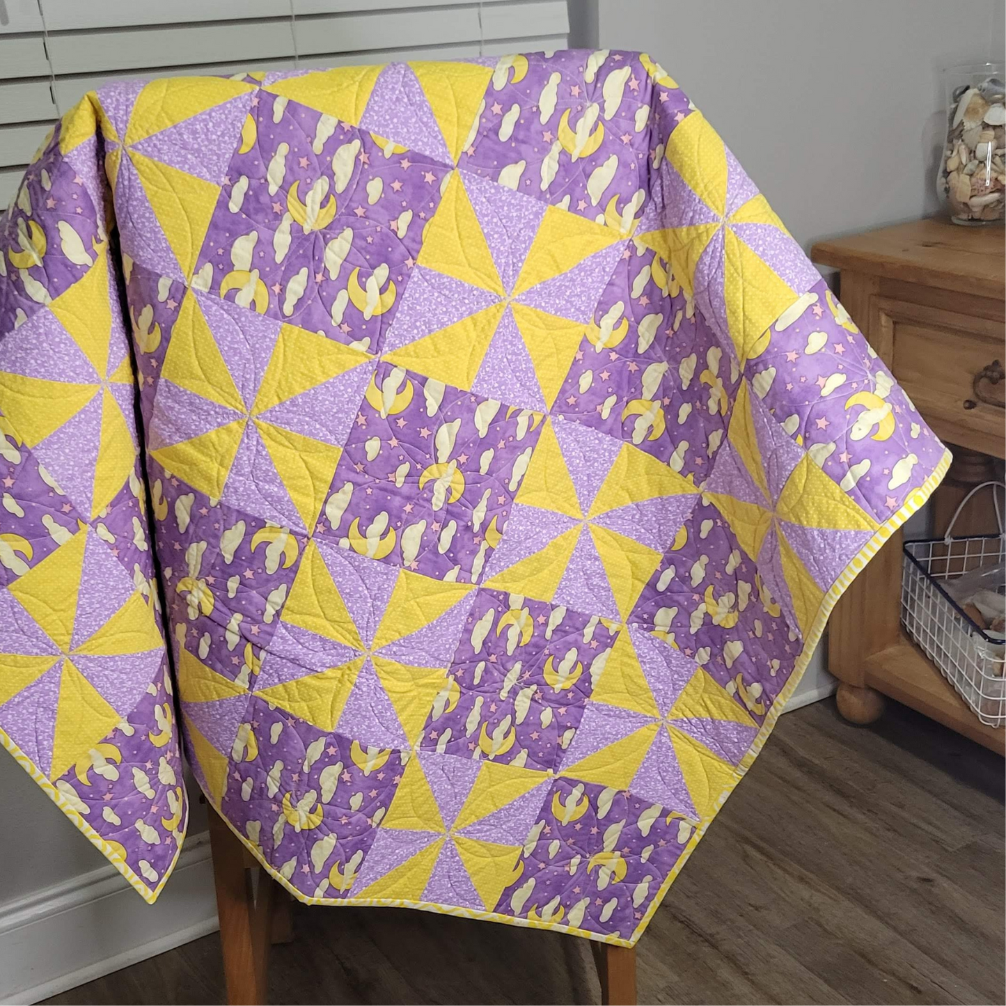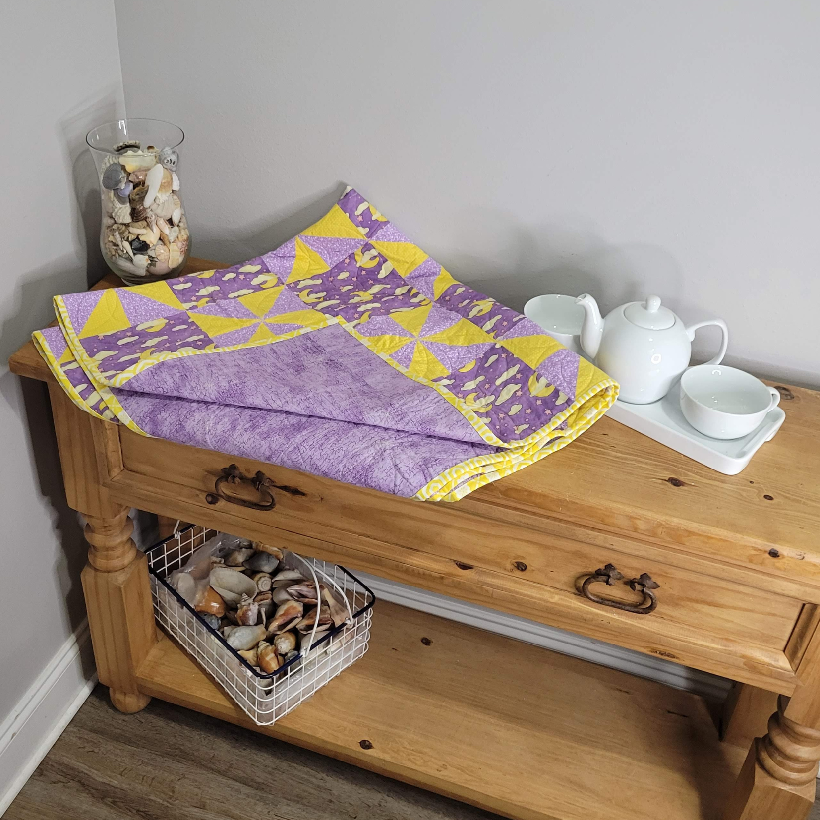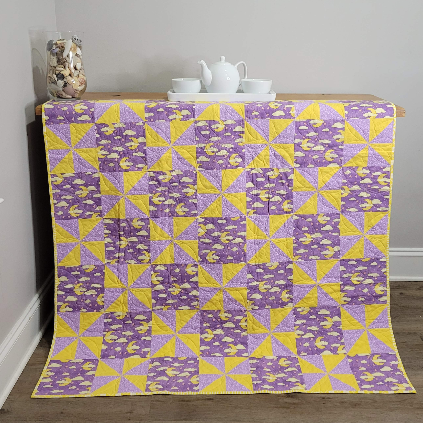 Are you looking for the perfect gift for that beautiful new addition to the family? Snuggle up those littles in this cute quilt in yellows and purples with moons and stars. Machine pieced and free motion machine quilted right here in my quilting studio with an edge to edge design. Measures 45x45 inches. All fabrics are excellent quality, 100% cotton and can be machine washed in cold and dried on low. They will soften with use and washing.