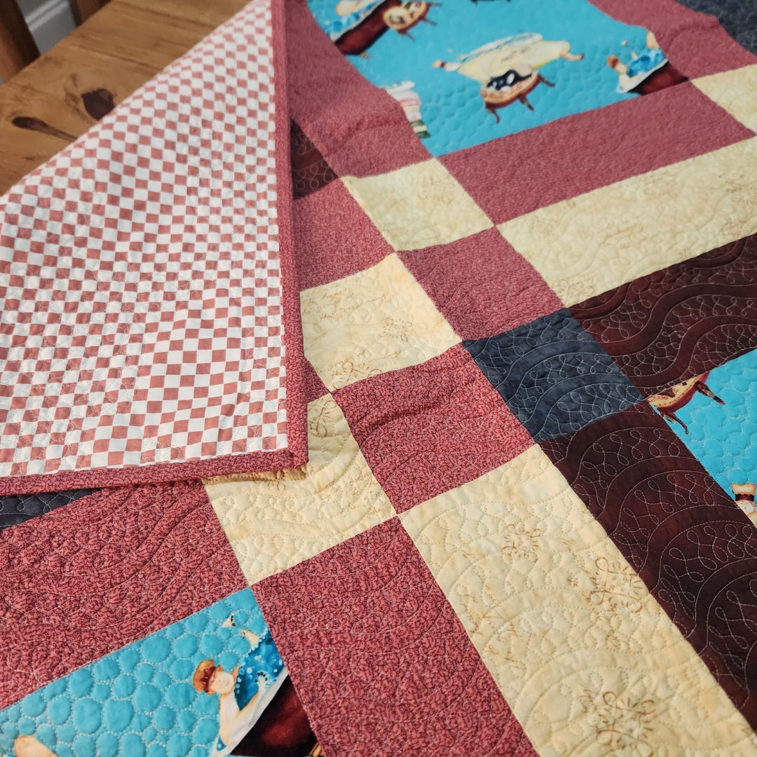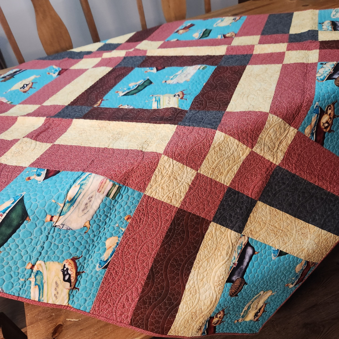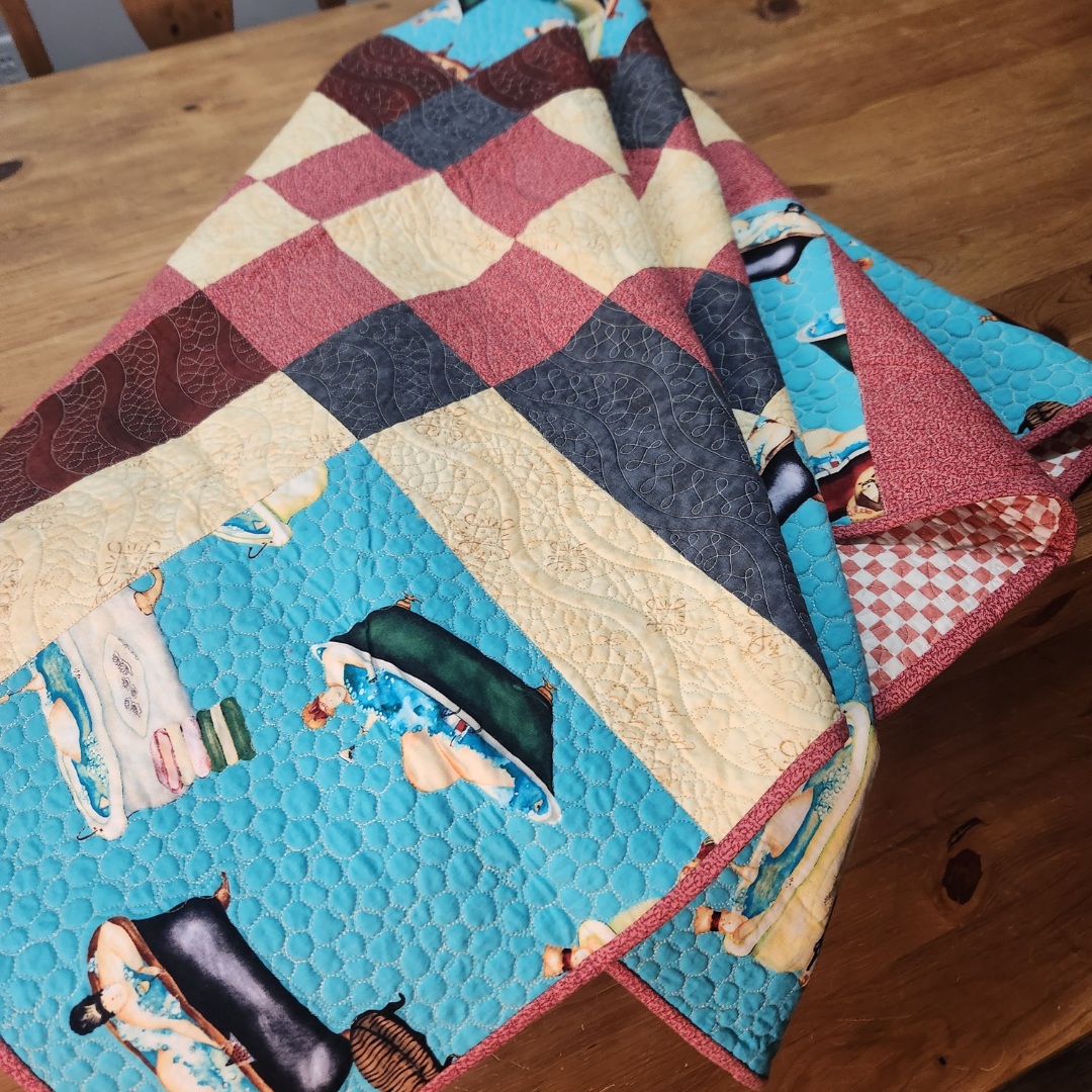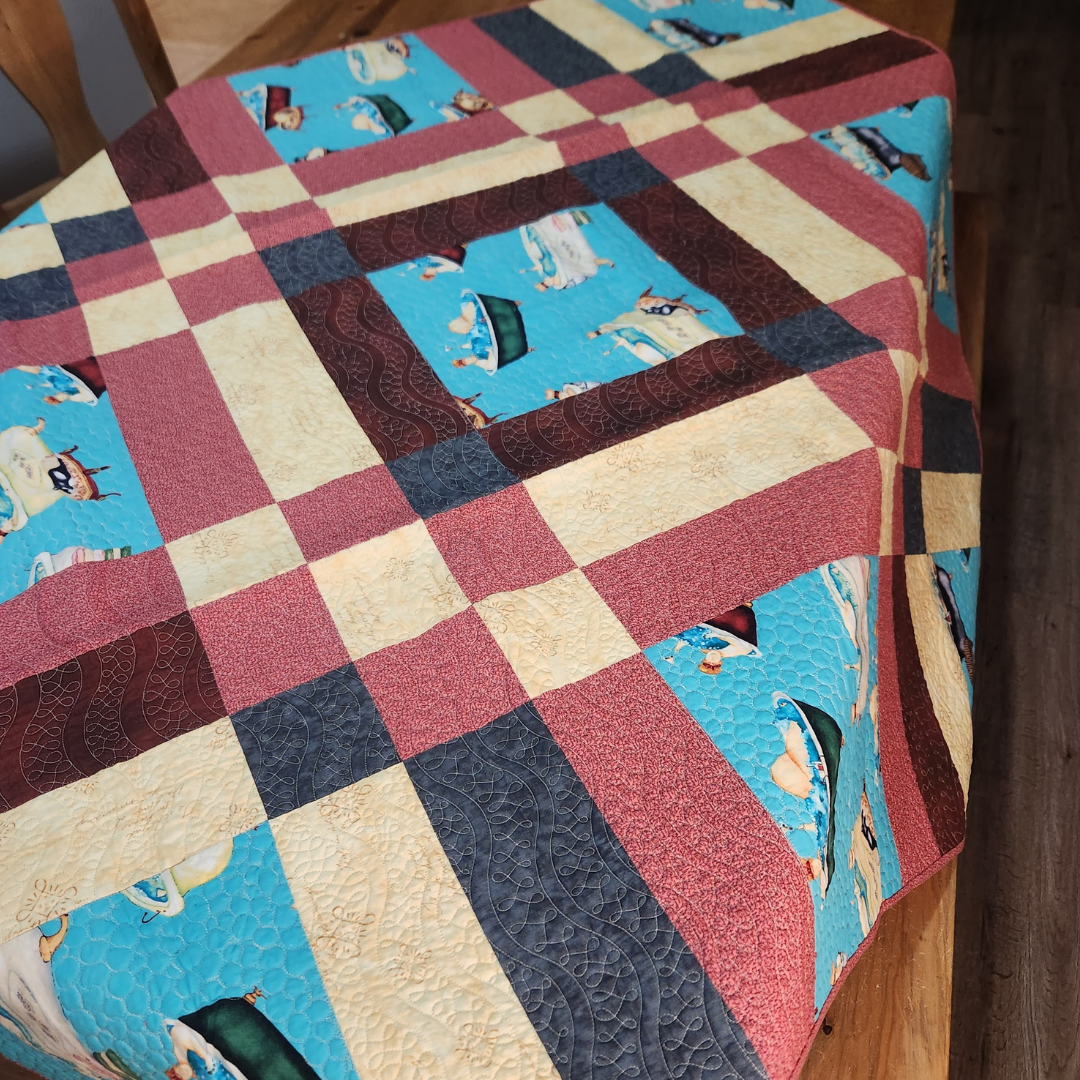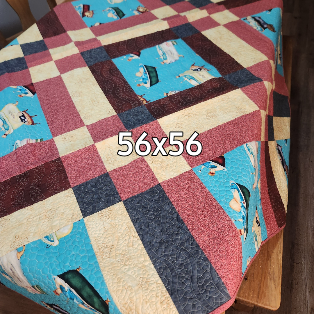 Snuggled up on the couch or tossed on a chair this medium sized quilt will add color to any room in the house. It measures approximately 56x56 inches and is made from 100% cotton fabrics. Free motion quilted by me in my quilting studio in pebbles and custom pattern, making it a one of a kind treasure. Made up in turquoise, salmon, burgundy, gray, and pale yellow.