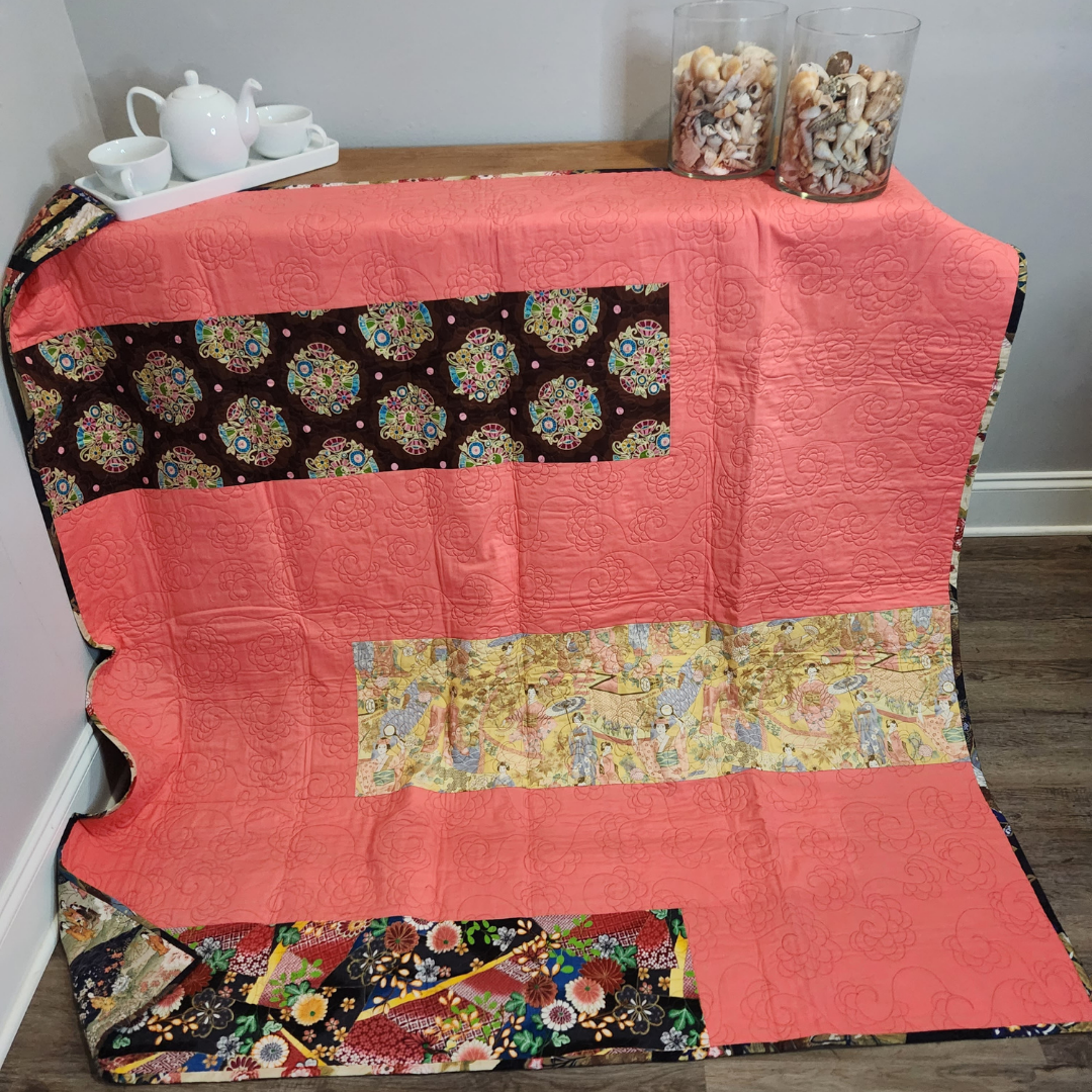 Snuggled up on the couch or tossed on a chair this medium sized quilt will add color to any room in the house. It measures approximately 59x60 inches and is made from 100% cotton fabrics. Free motion quilted by me in my quilting studio in an edge to edge flower design pattern, making it a one of a kind treasure. Made up in basically every color with blocks bordered in black. With the back of the quilt pieced from fabrics in the front. It would go with every color scheme.