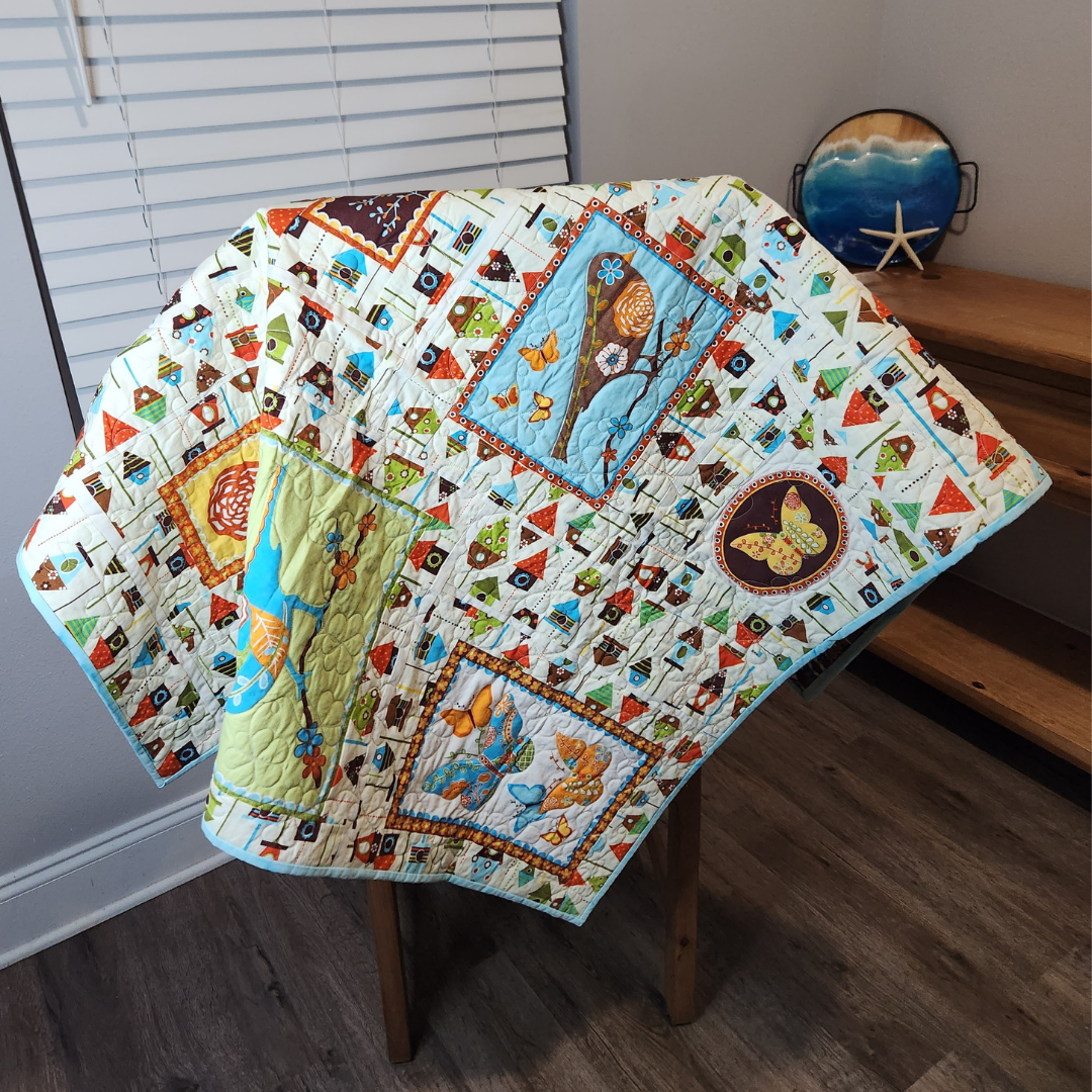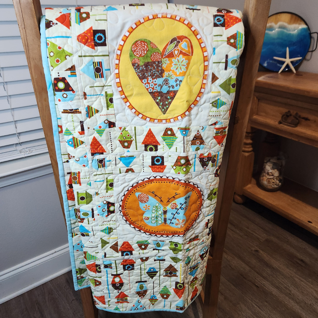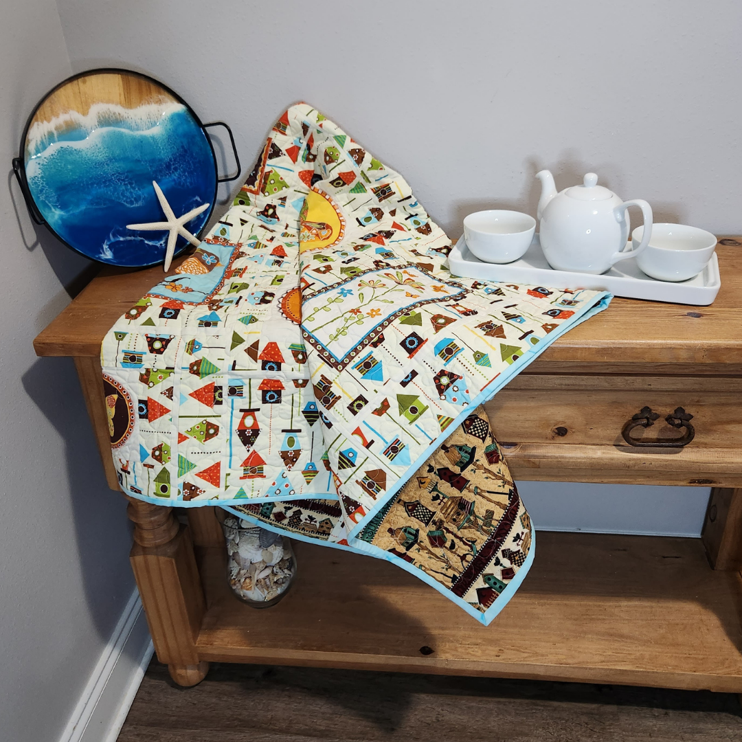 Hanging on a wall or tossed on a chair this small quilt will add color to any room in the house. It measures approximately53x42 inches and is made from 100% cotton fabrics. Free motion quilted by me in my quilting studio in a meandering flower pattern, making it a one of a kind treasure. Made up in vibrant yellow, orange, blue, brown and green on an ecru background.