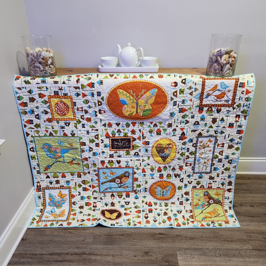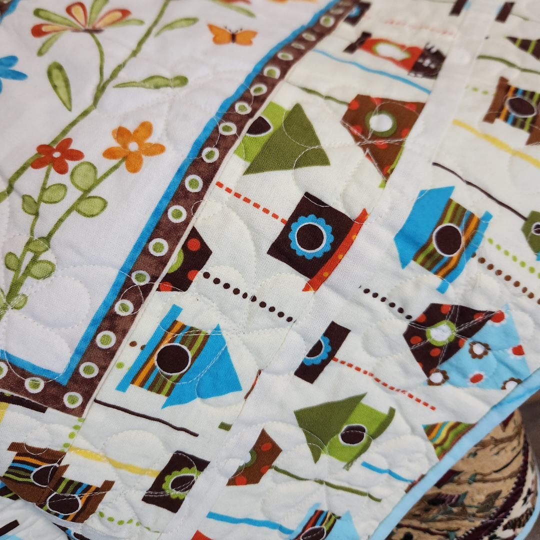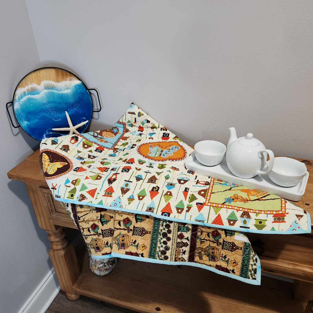 Hanging on a wall or tossed on a chair this small quilt will add color to any room in the house. It measures approximately53x42 inches and is made from 100% cotton fabrics. Free motion quilted by me in my quilting studio in a meandering flower pattern, making it a one of a kind treasure. Made up in vibrant yellow, orange, blue, brown and green on an ecru background.