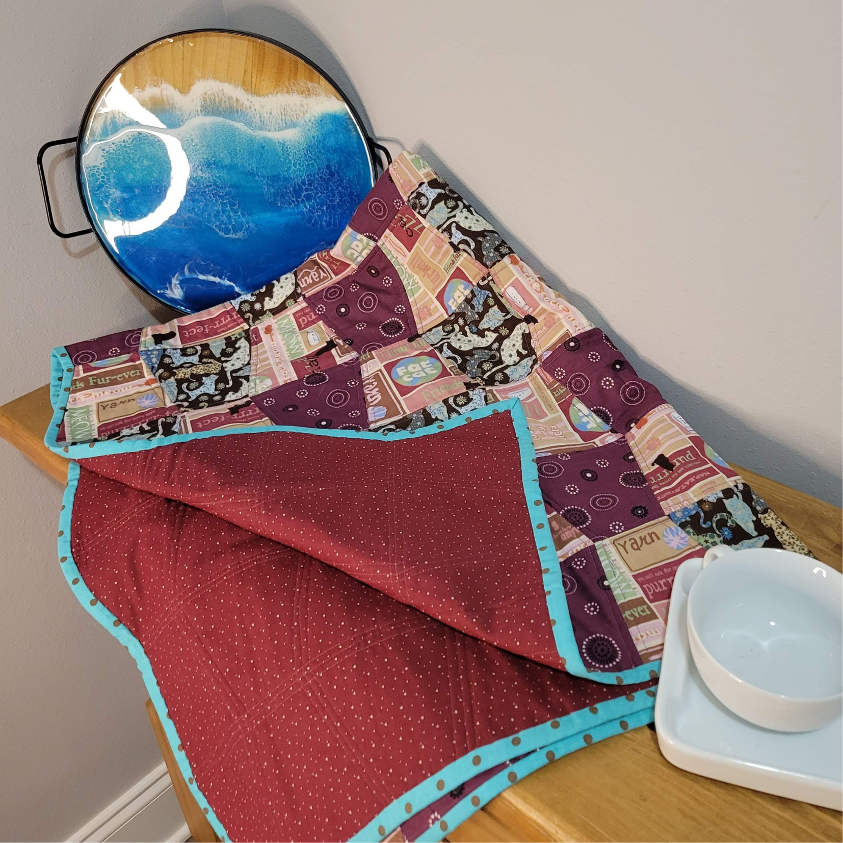 Made up in burgundies, pinks and browns with teal polka dot accent on the binding.