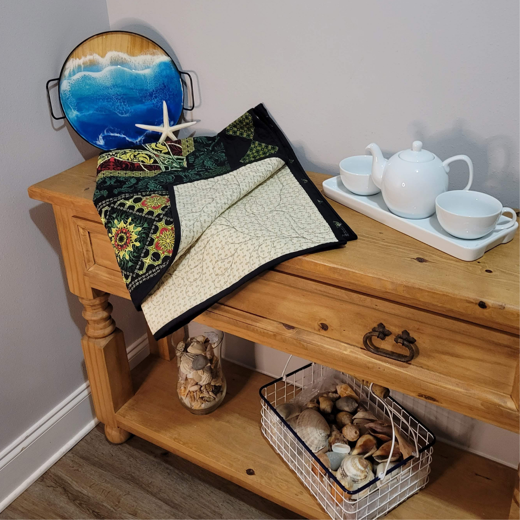Wall hanging in a Celtic design. This would look wonderful decorating a wall or tossed over a chair. It measures approximately 35x41 inches. Made from 100% cotton and quilted by me in my quilt studio with free motion edge to edge feathers making it a one of a kind treasure that will add warmth to any room in your home. Made up in black, green, teal, red, yellow and gold colors.