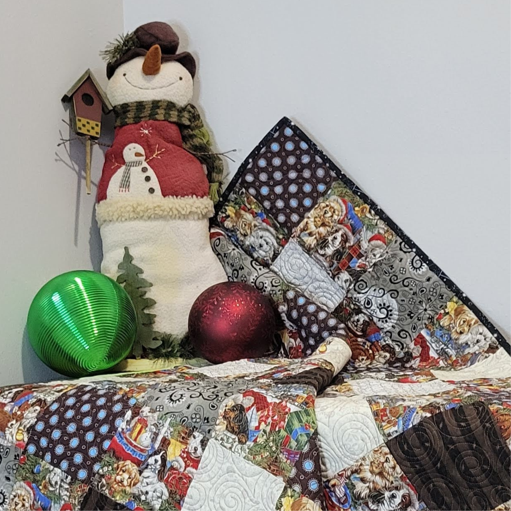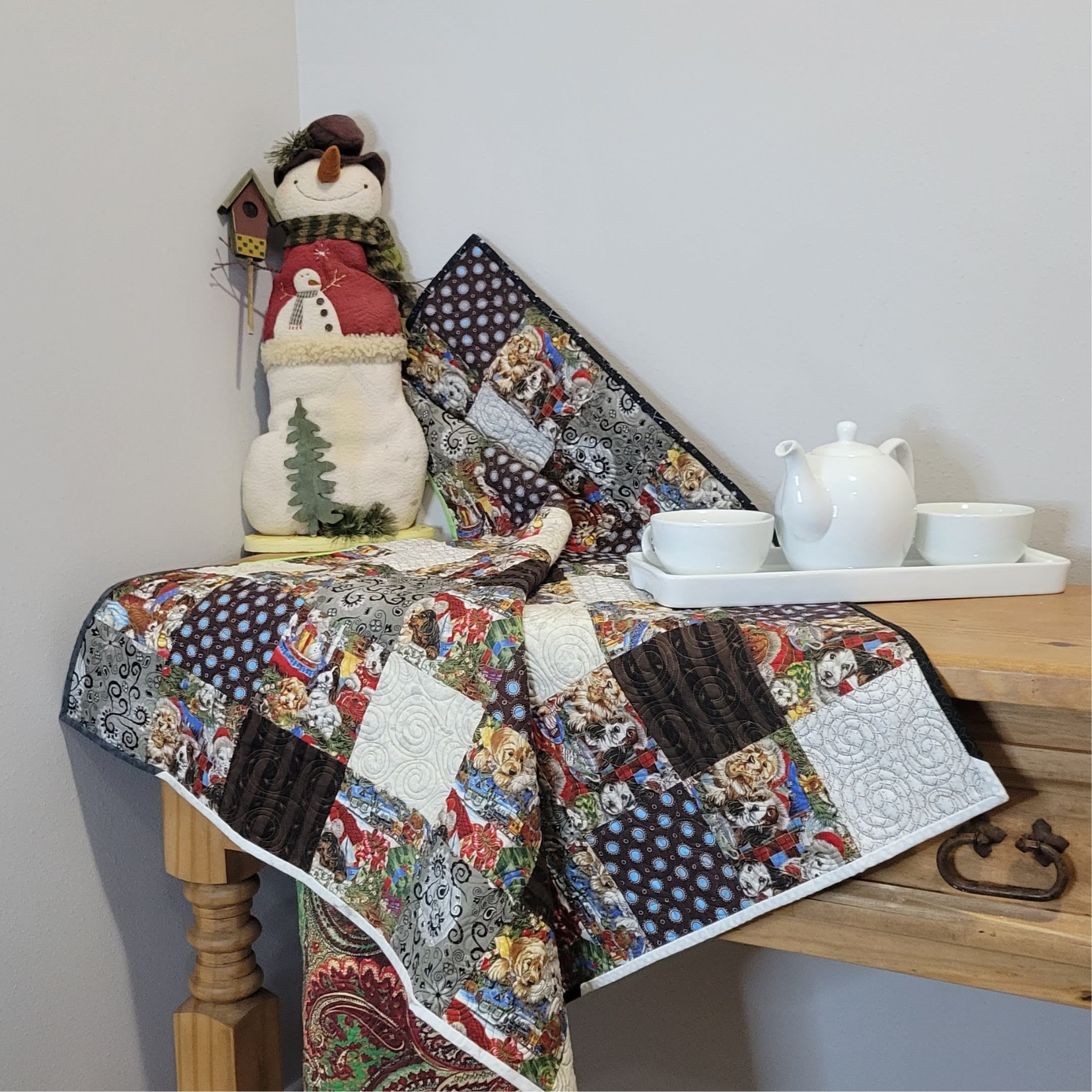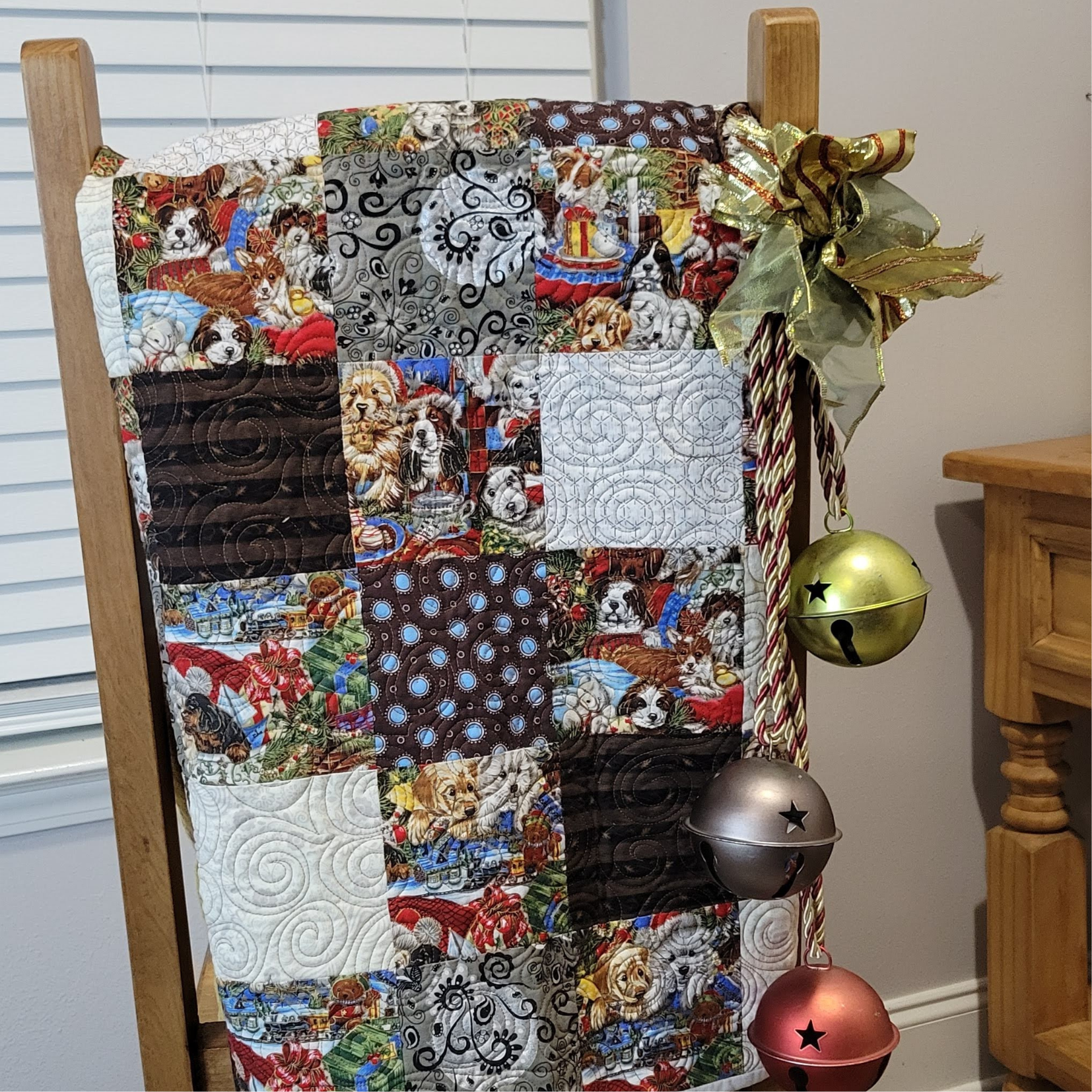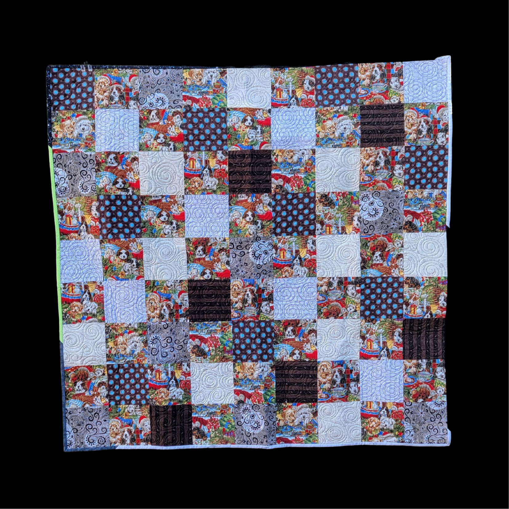 This quilt would look beautiful as a decoration on your wall or inviting when tossed on a chair. It measures 40"x 40". Multi-colored with browns, reds, greens, blues, and cream with fun Christmas puppies throughout, made of 100% cotton and free motion quilted by myself in my quilting studio with edge to edge swirls.