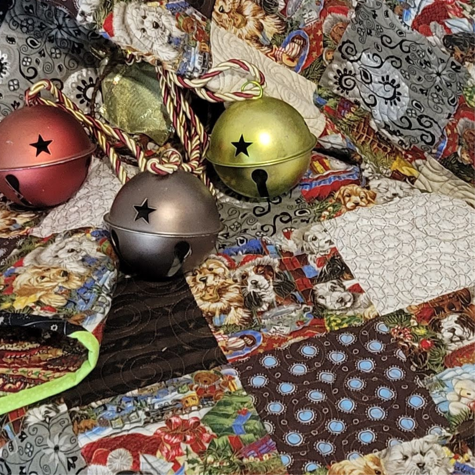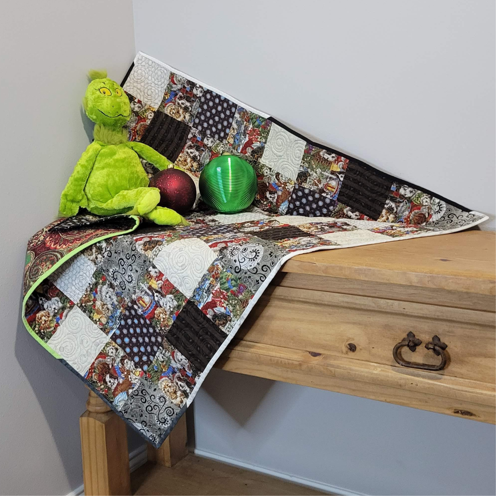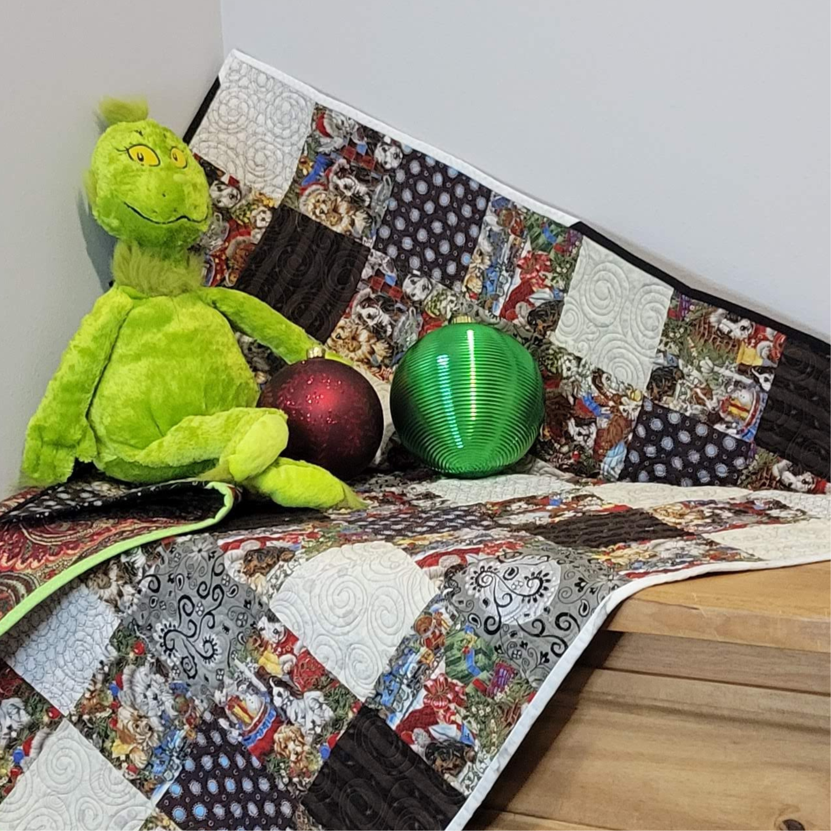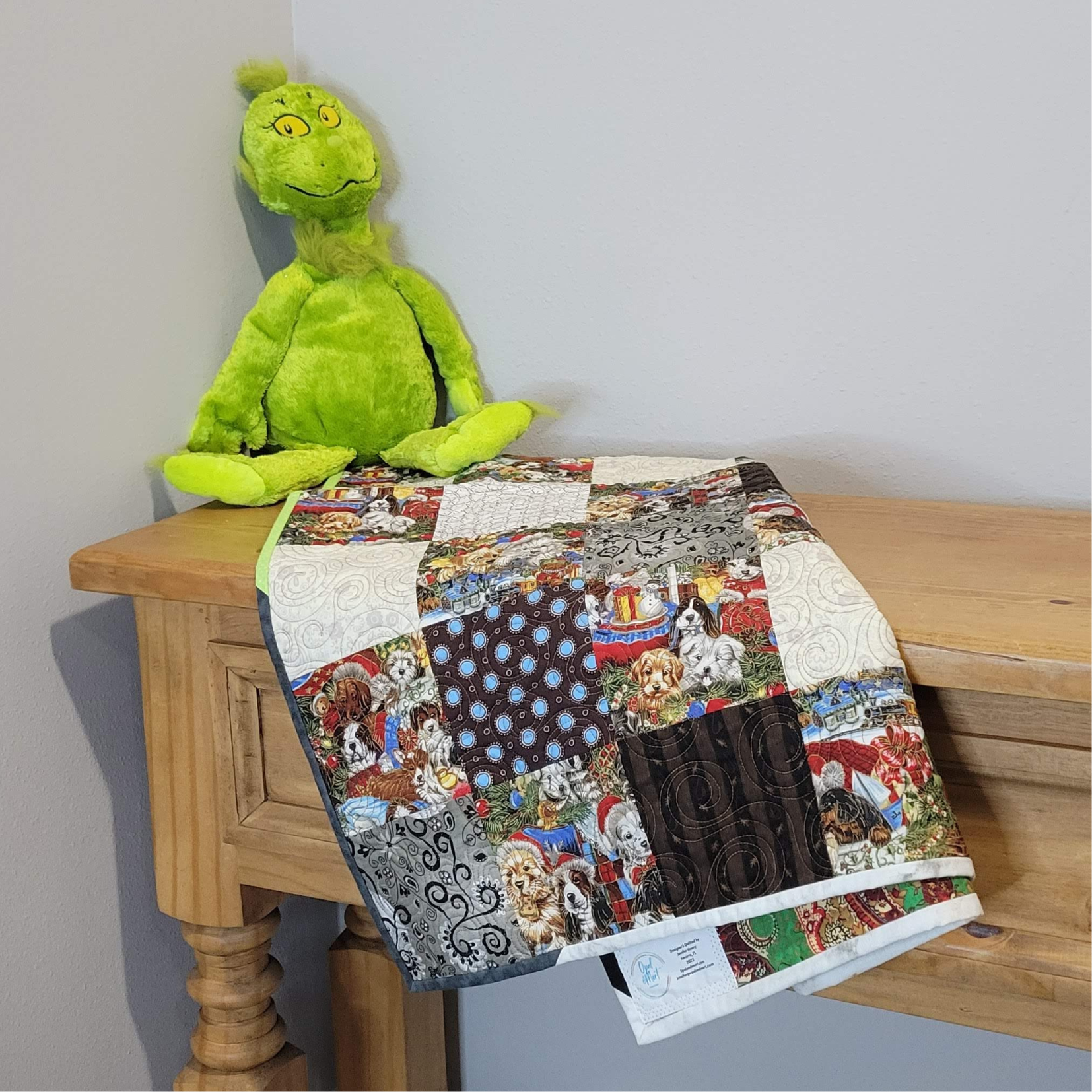 This quilt would look beautiful as a decoration on your wall or inviting when tossed on a chair. It measures 40"x 40". Multi-colored with browns, reds, greens, blues, and cream with fun Christmas puppies throughout, made of 100% cotton and free motion quilted by myself in my quilting studio with edge to edge swirls.