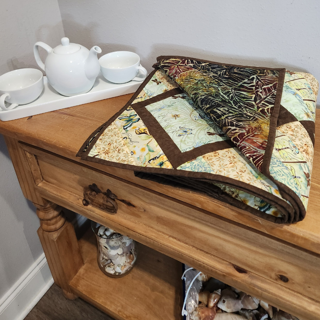 Hanging on a wall or tossed on a chair this small quilt will add color to any room in the house. It measures approximately 53x54 inches and is made from 100% cotton fabrics. Free motion quilted by me in my quilting studio in a custom pattern, making it a one of a kind treasure. Made up in browns and greens.