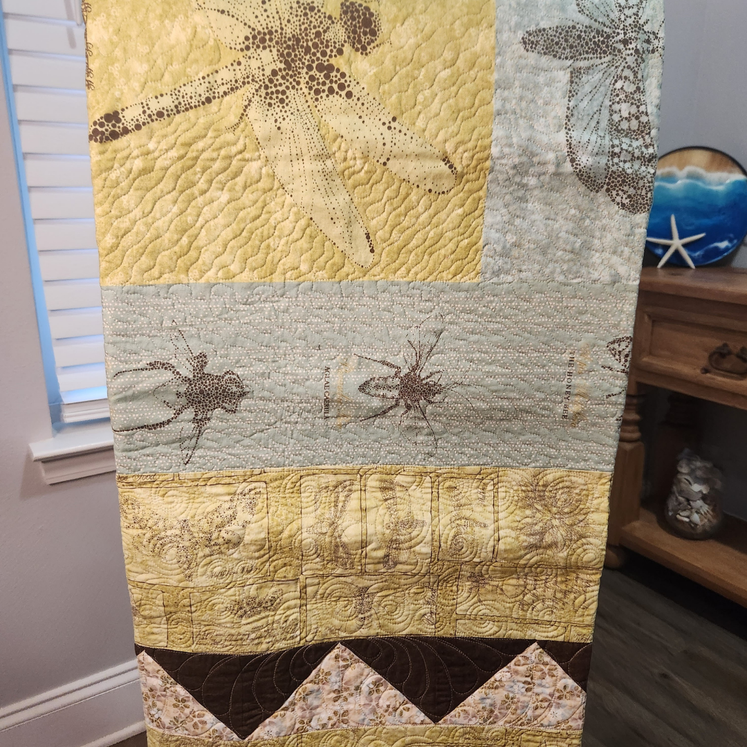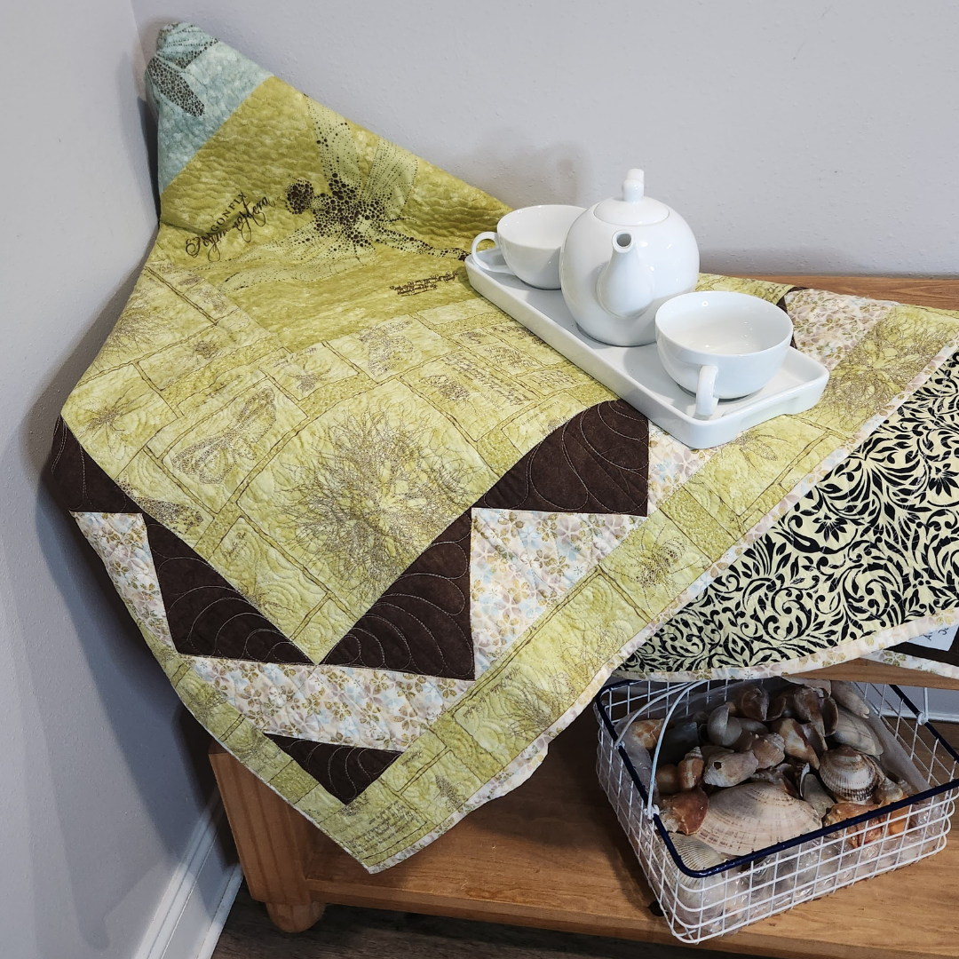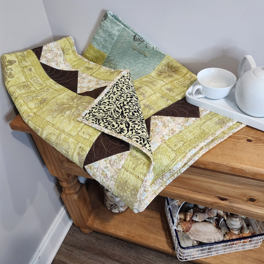 Hanging on a wall or tossed on a chair this small quilt will add color to any room in the house. It measures approximately 48x70 inches and is made from 100% cotton fabrics. Free motion quilted by me in my quilting studio in an edge to edge custom pattern, making it a one of a kind treasure. Made up in aqua, yellow, brown and off white.