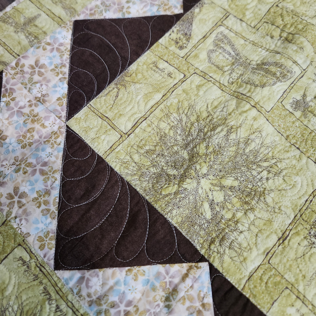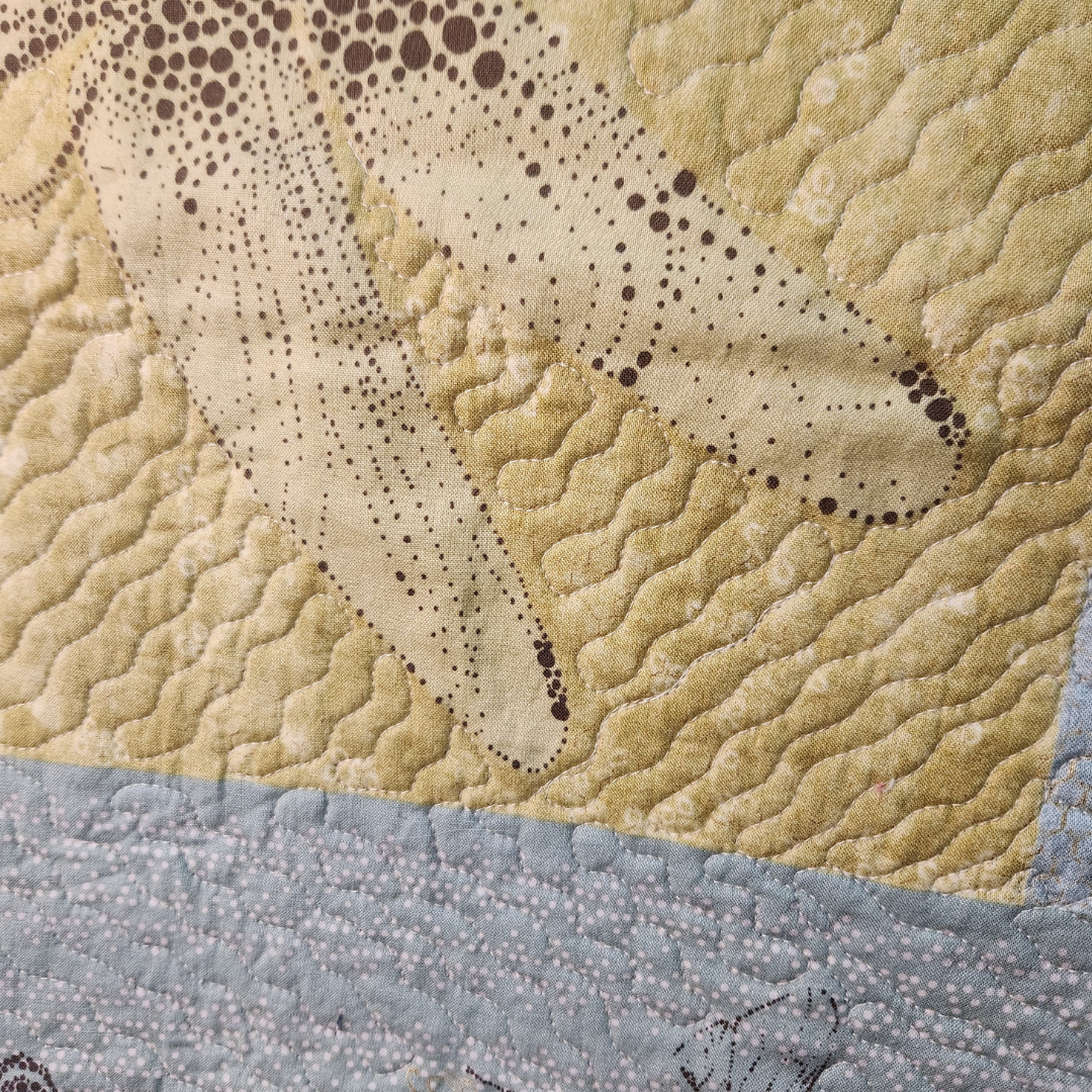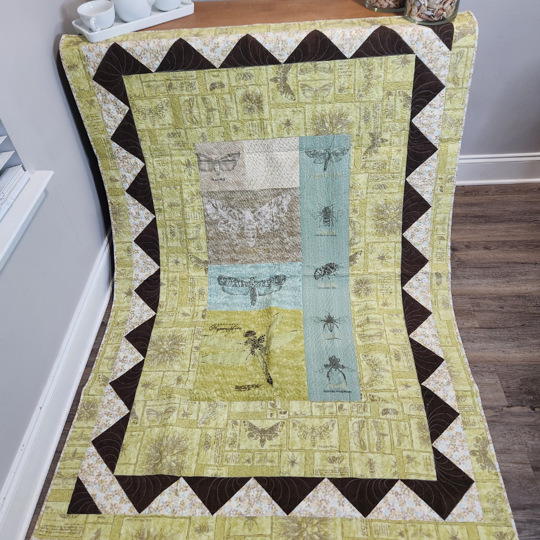 Hanging on a wall or tossed on a chair this small quilt will add color to any room in the house. It measures approximately 48x70 inches and is made from 100% cotton fabrics. Free motion quilted by me in my quilting studio in an edge to edge custom pattern, making it a one of a kind treasure. Made up in aqua, yellow, brown and off white.