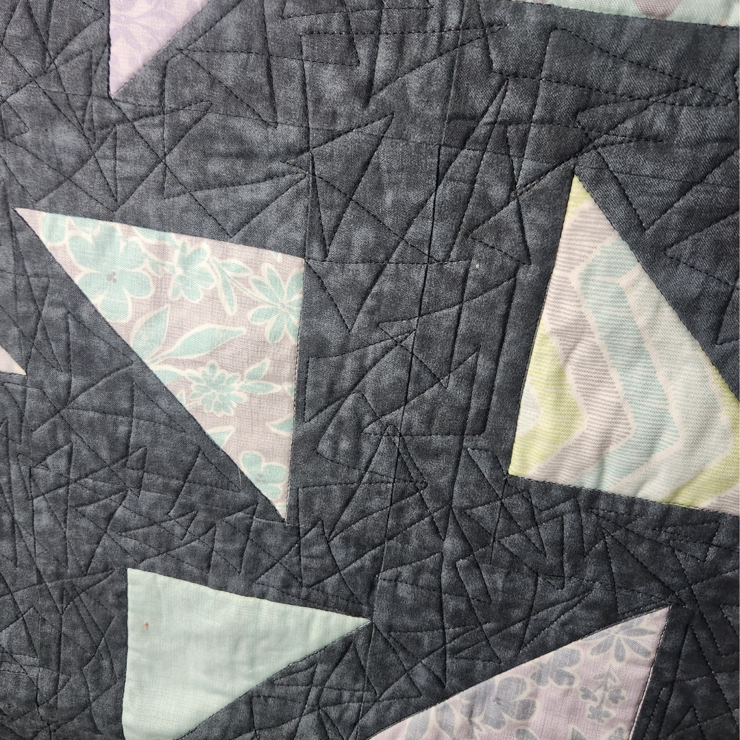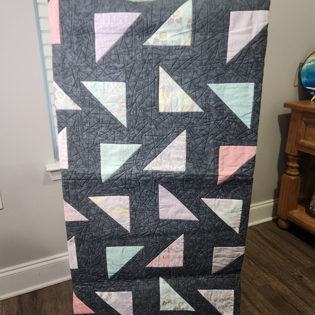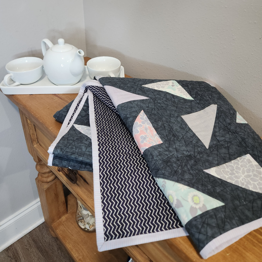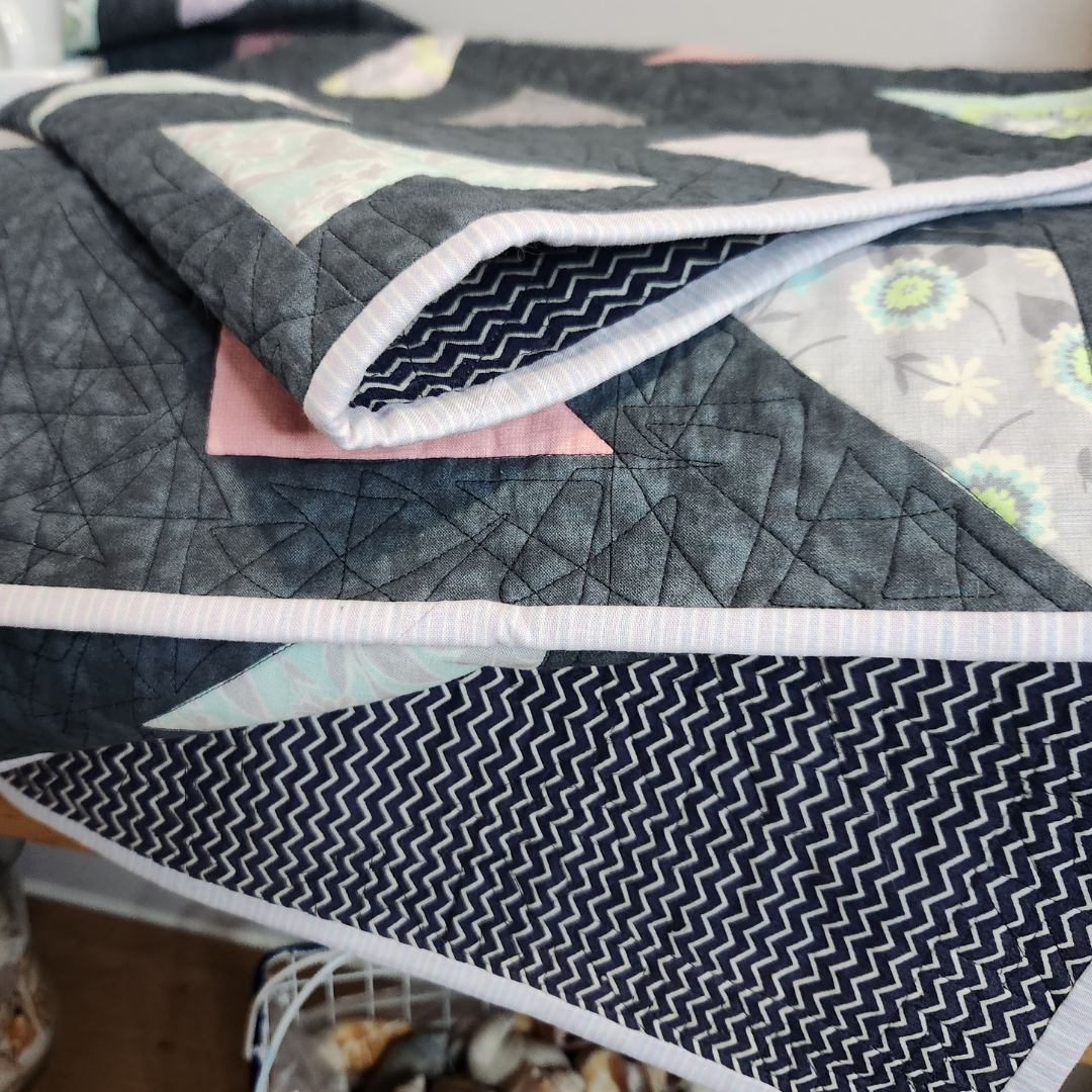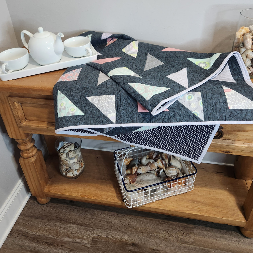 Snuggled up on the couch or tossed on a chair this medium sized quilt will add color to any room in the house. It measures approximately 48x54 inches and is made from 100% cotton fabrics. Free motion quilted by me in my quilting studio in a geometric edge to edge pattern, making it a one of a kind treasure. Made up in pastel pink green, aqua, gray with a dark gray background colors.
