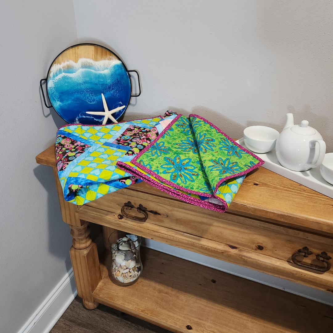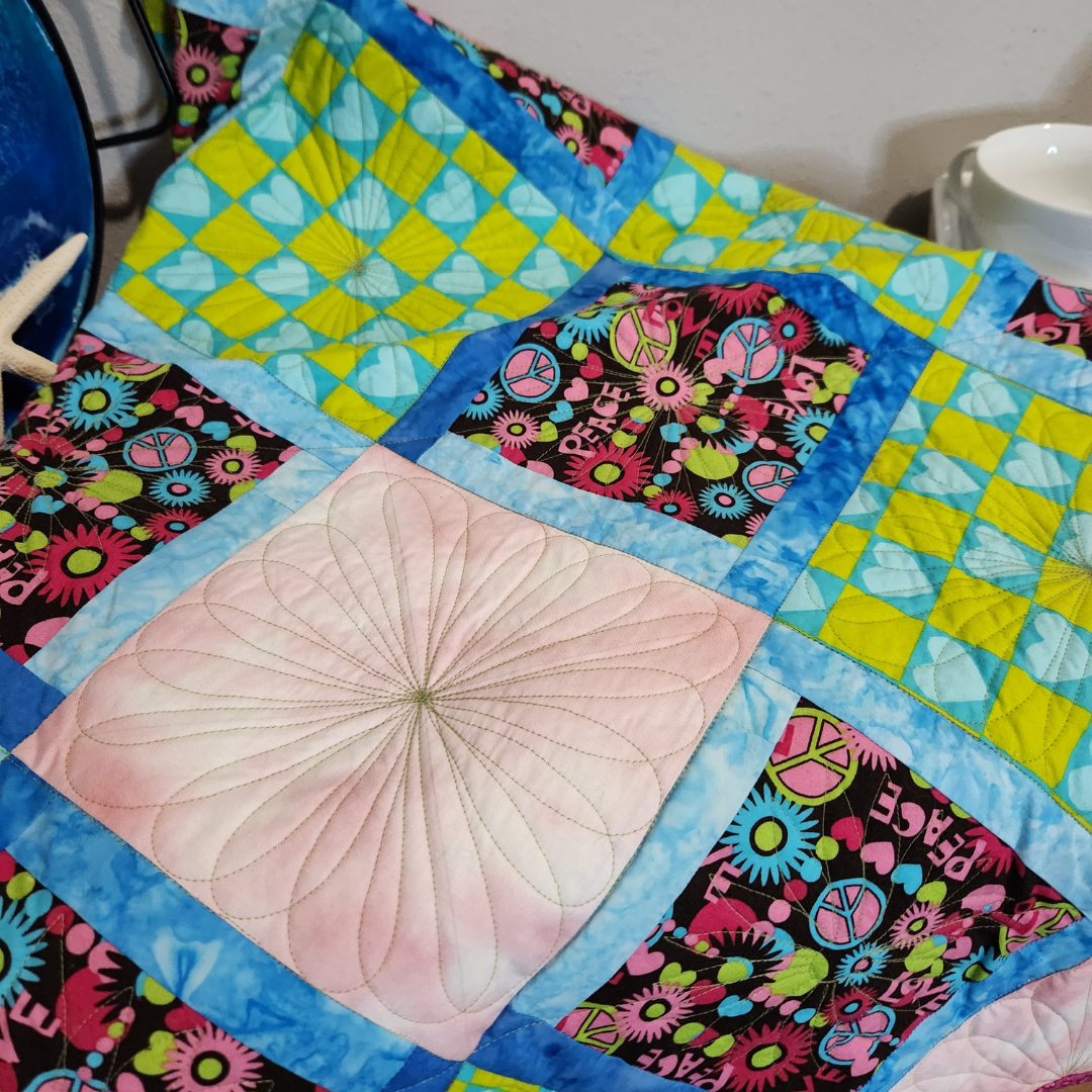 Hanging on a wall or tossed on a chair this small quilt will add color to any room in the house. It measures approximately50x51 inches and is made from 100% cotton fabrics. Free motion quilted by me in my quilting studio in a custom pattern, making it a one of a kind treasure. Made up in greens, blues and pinks.
