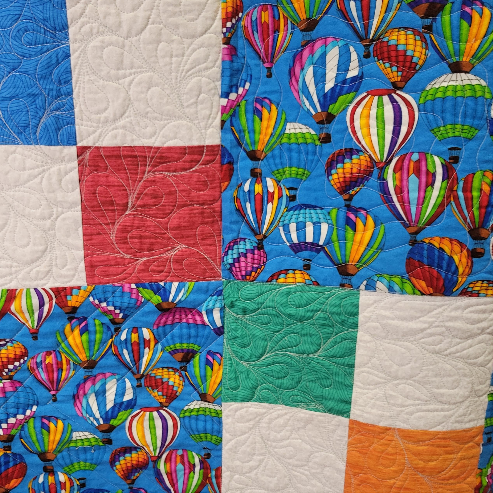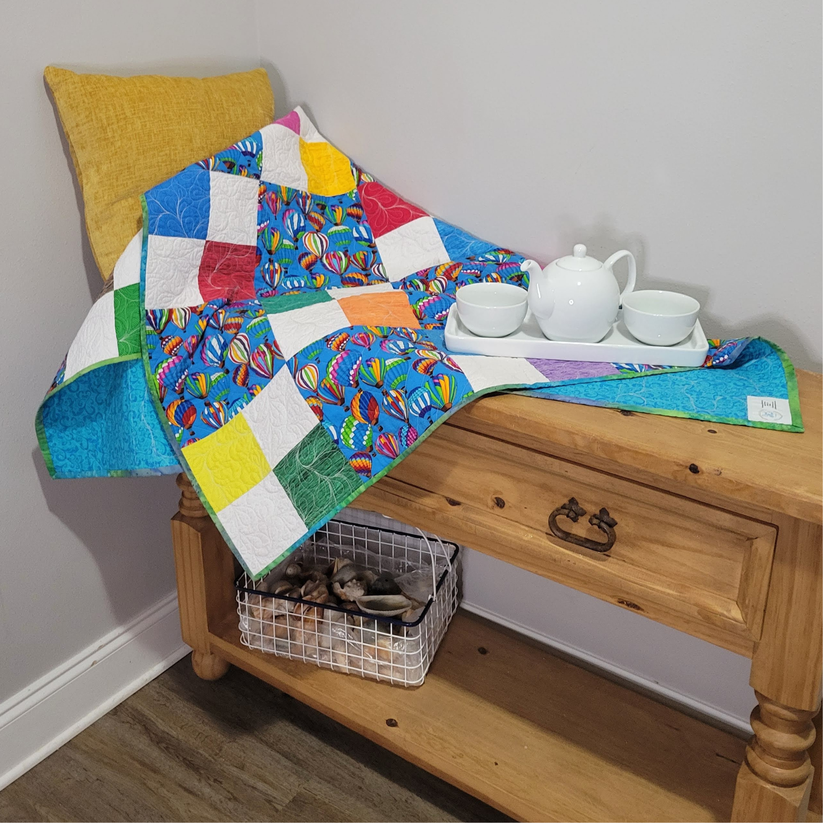 Hot air balloon inspired. Vibrant colors. Lap or wall quilt, measures 44x52 inches. 100% cotton fabrics. Free motion quilted on my longarm in my quilting studio with edge to edge feather design. One of a kind treasure.