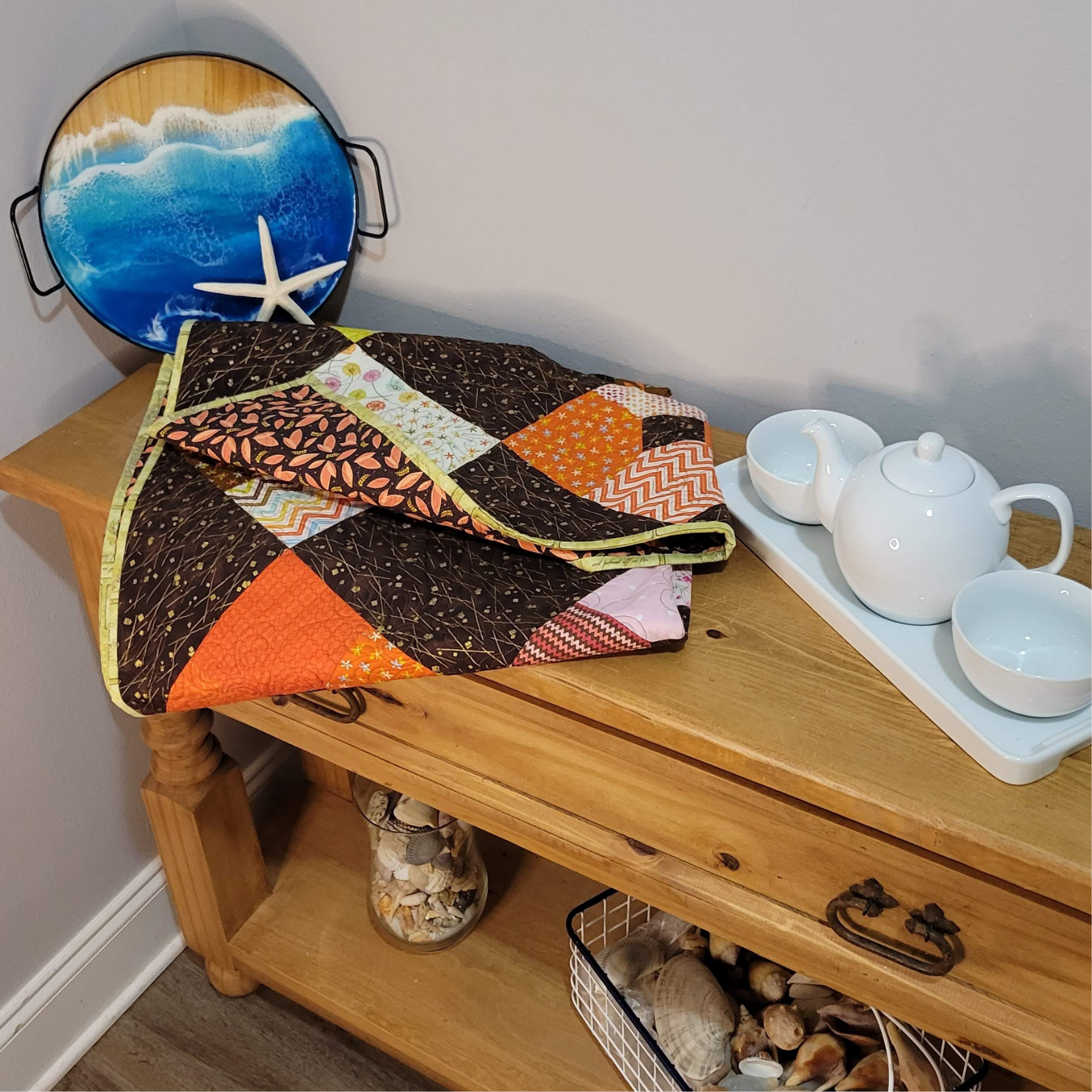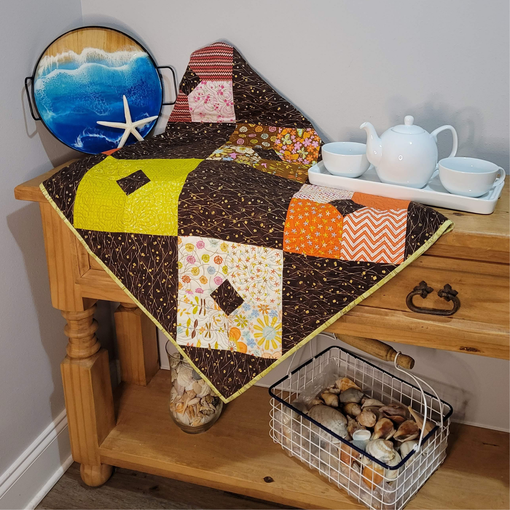 Hanging on a wall or tossed on a chair this small quilt will add color to any room in the house. It measures approximately 37x49 inches and is made from 100% cotton fabrics. Free motion quilted by me in my quilting studio in an edge to edge pattern, making it a one of a kind treasure.