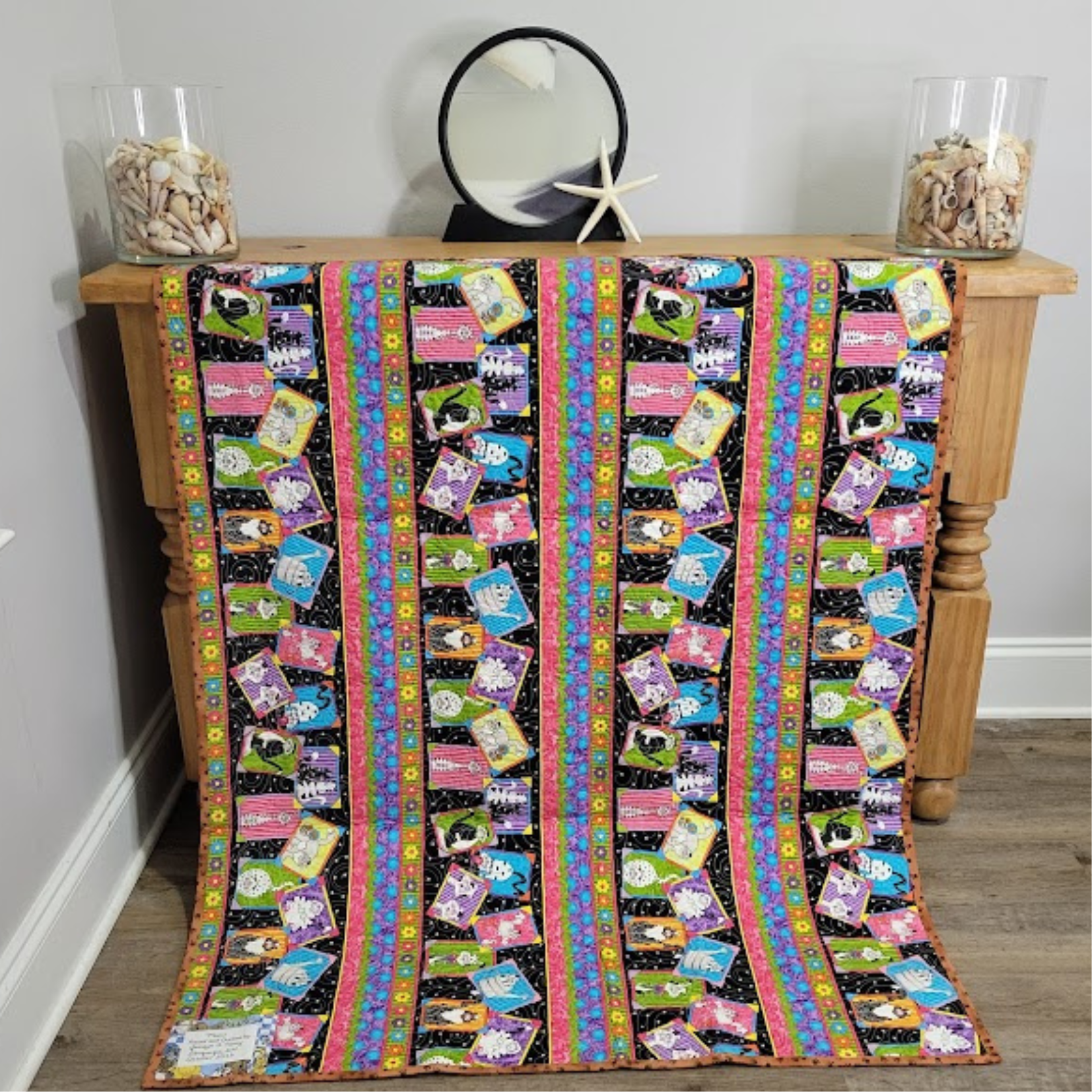Playful cats all over. With blues, brown, green, black gray and checkerboard. A bright colorful cat print has been used for the back. Lap or wall quilt, measures 38x47 inches. 100% cotton fabrics. Free motion quilted on my longarm in my quilting studio with edge to edge swirls design. One of a kind treasure.