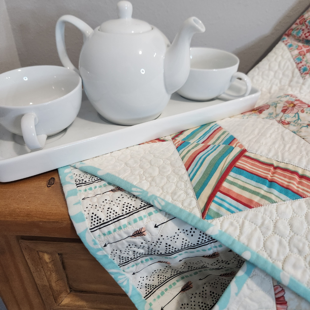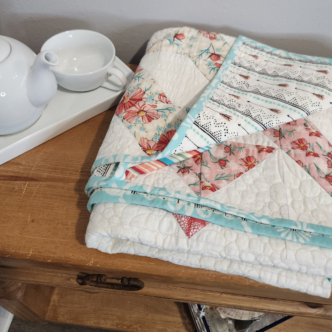 Snuggled up on the couch or tossed on a chair this medium sized quilt will add color to any room in the house. It measures approximately 52 inches square and is made from 100% cotton fabrics. Free motion quilted by me in my quilting studio in a total custom pattern, making it a one of a kind treasure. Made up in salmon, aqua, pastel pink, yellow and white colors.