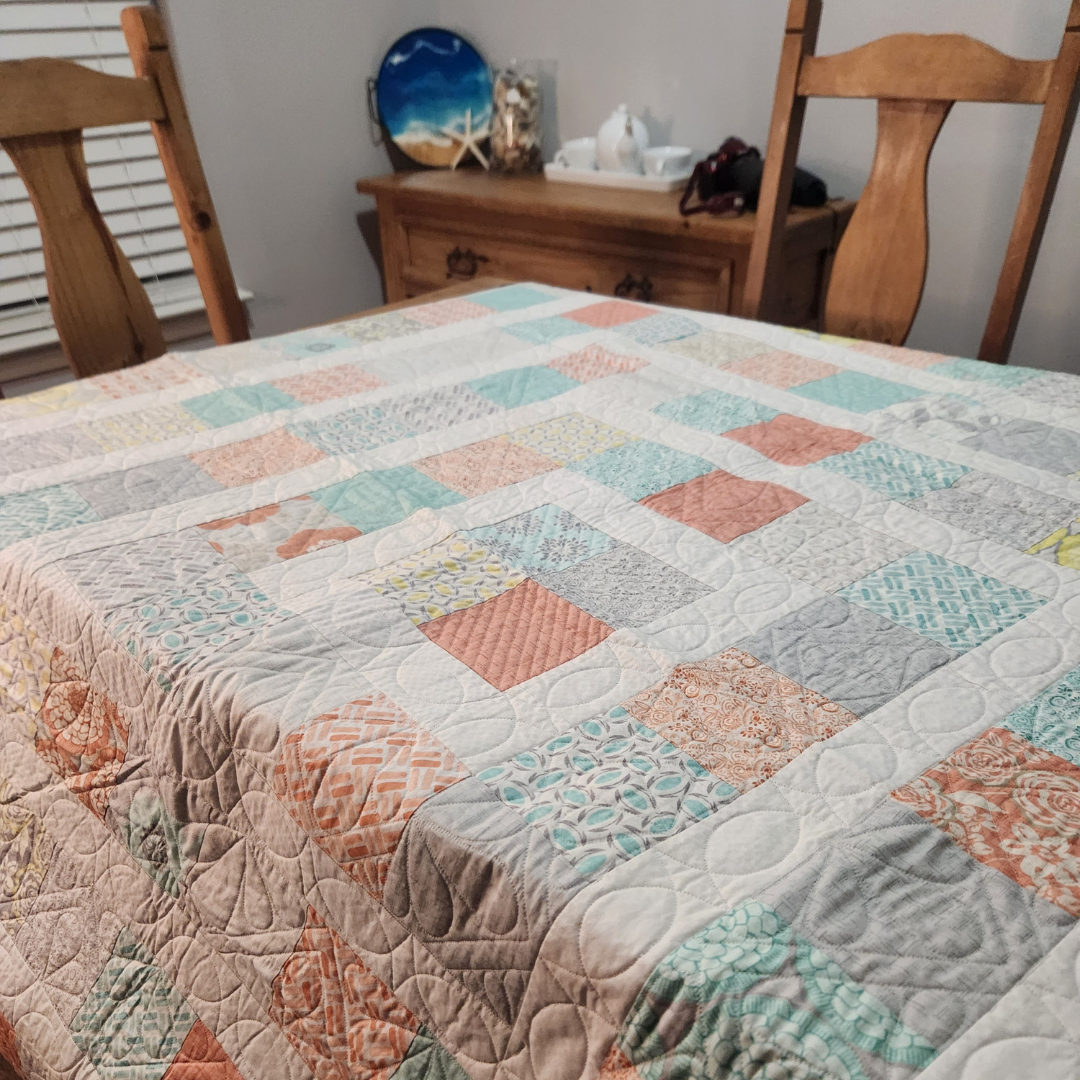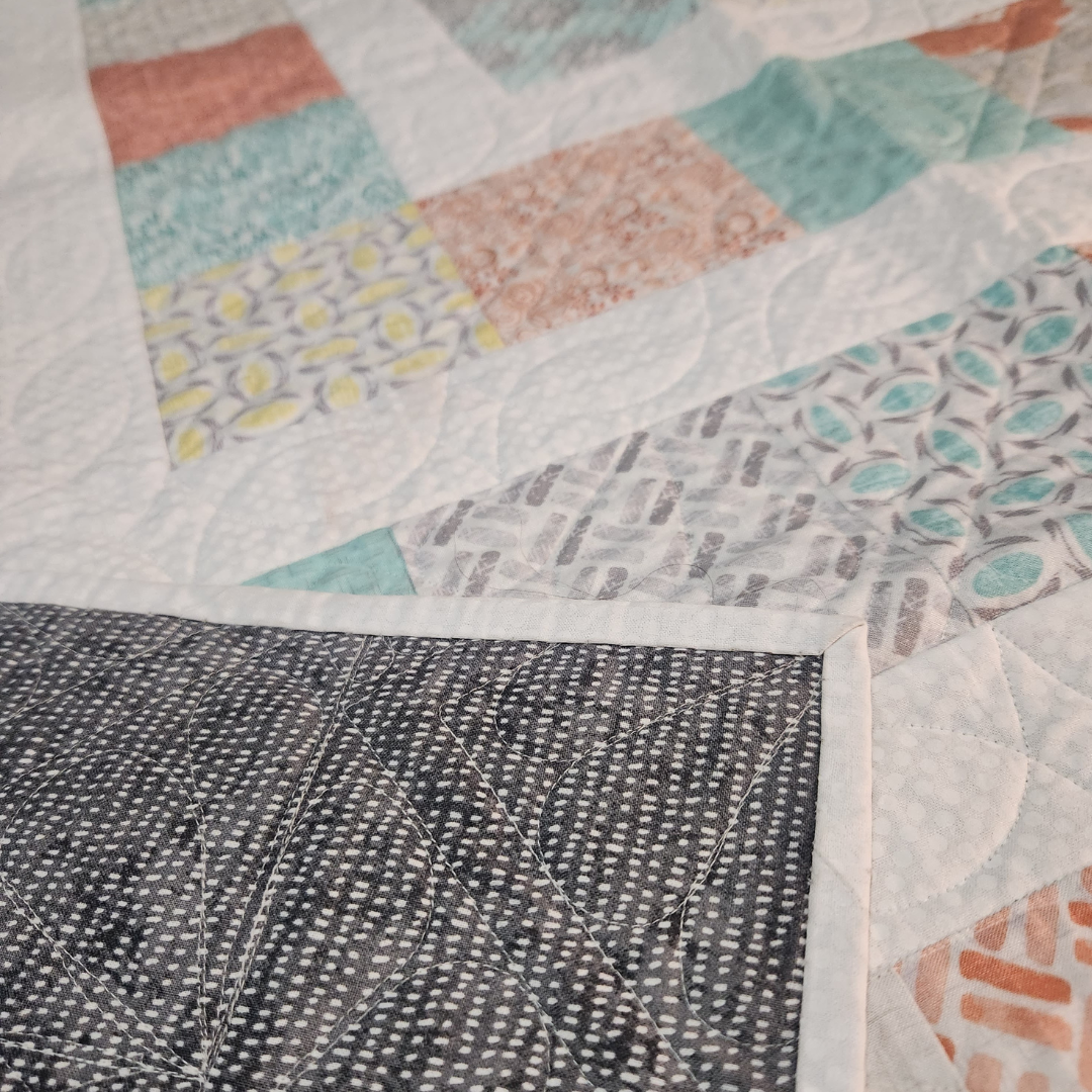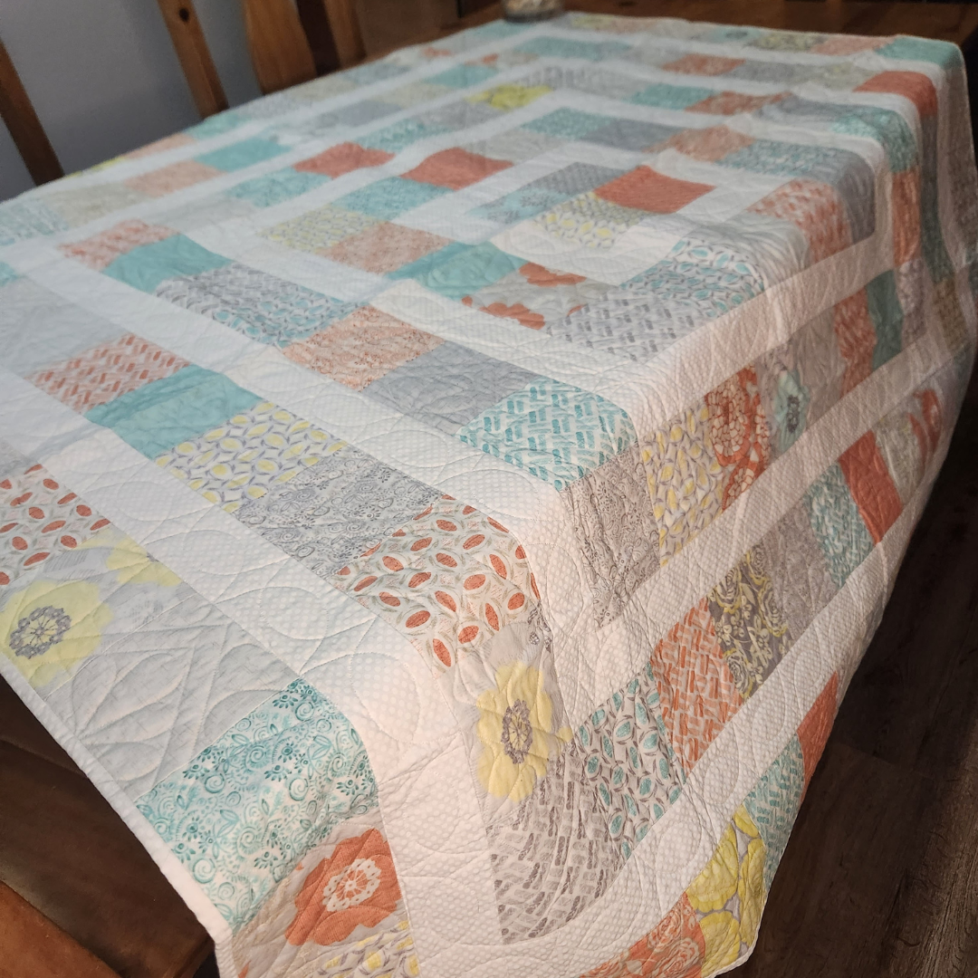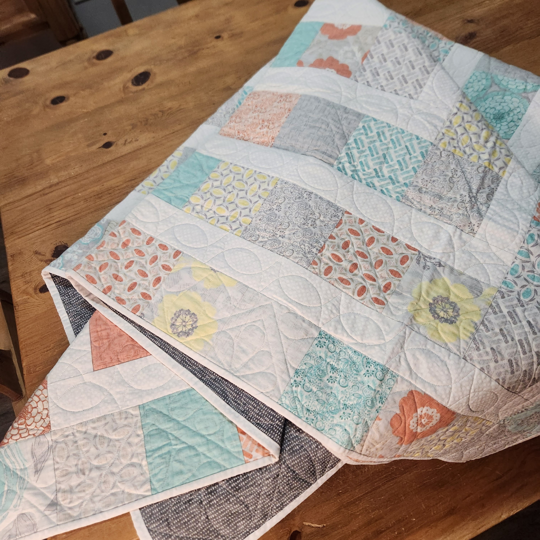 Snuggled up on the couch or tossed on a chair this medium sized quilt will add color to any room in the house. It measures approximately 62x62 inches and is made from 100% cotton fabrics. Free motion quilted by me in my quilting studio in a custom pattern, making it a one of a kind treasure. Made up in soft salmon, aqua yellow, gray colors.