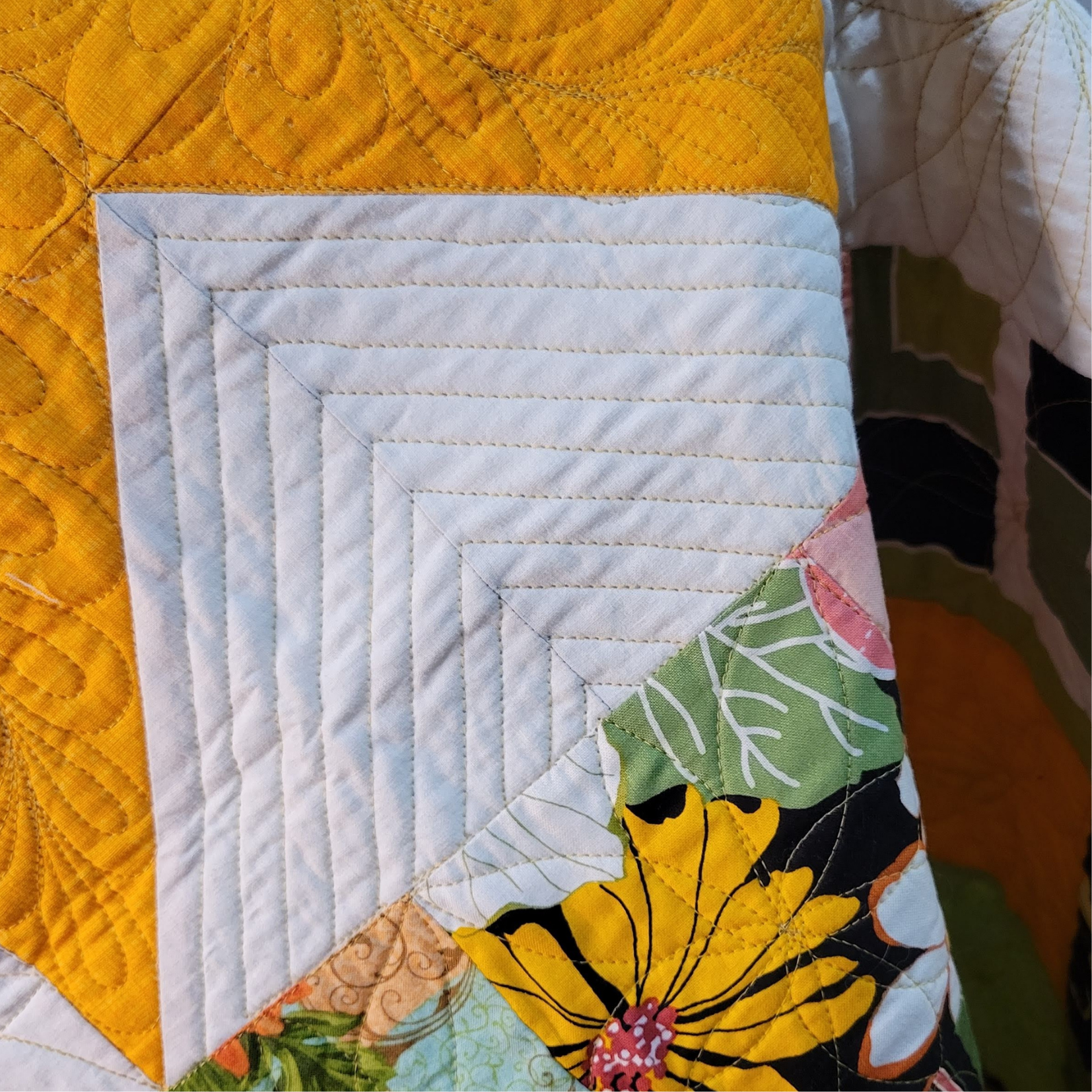 Hanging on a wall or tossed on a chair this small quilt will add color to any room in the house. It measures approximately 53 inches square and is made from 100% cotton fabrics. Free motion quilted by me in my quilting studio in feathers and spirograph circles patterns, making it a one of a kind treasure.