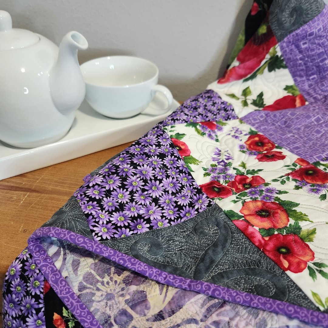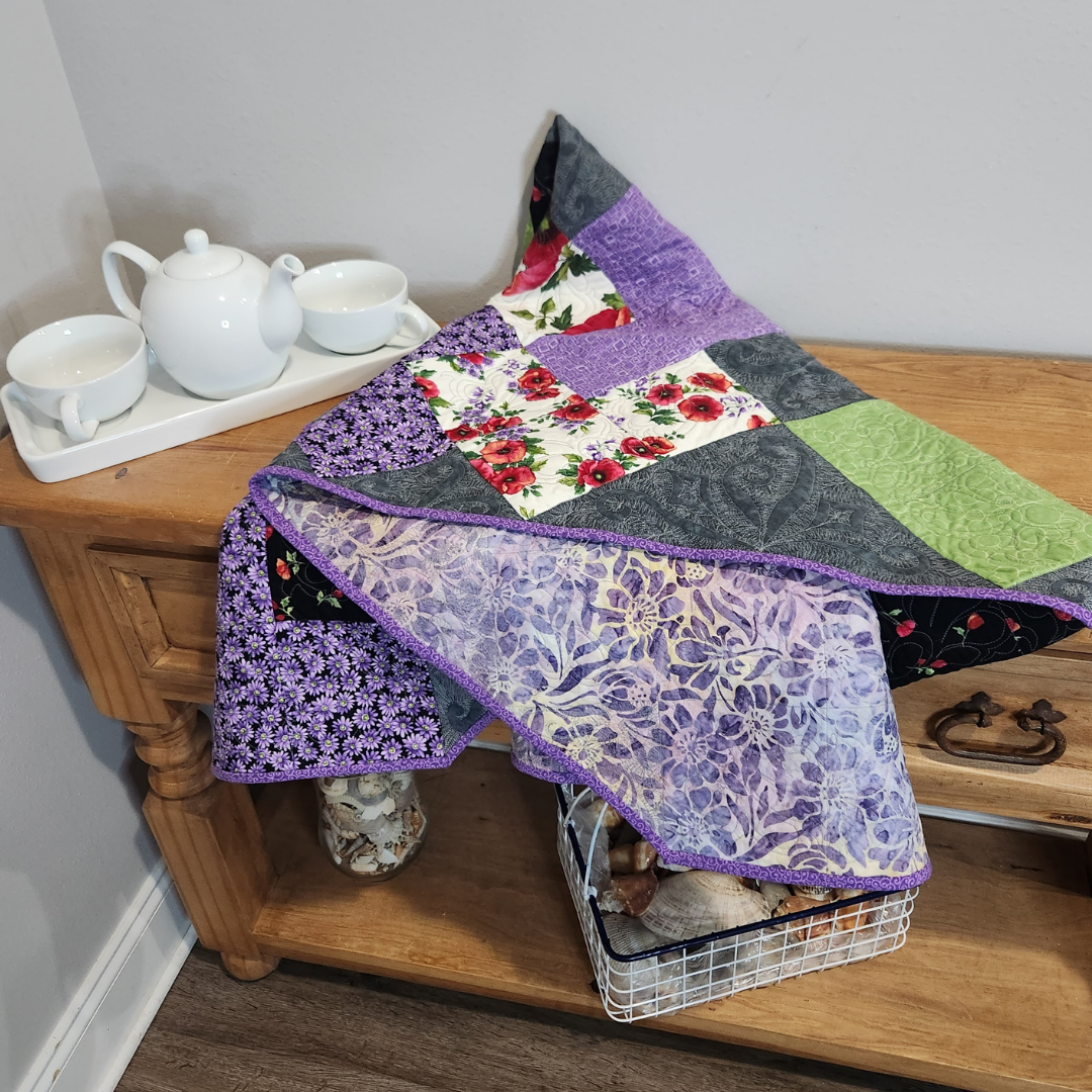 Hanging on a wall or tossed on a chair this small quilt will add color to any room in the house. It measures approximately 39x60 inches and is made from 100% cotton fabrics. Free motion quilted by me in my quilting studio in a custom thread painting pattern, making it a one of a kind treasure. Made up in purple, green, gray and red poppies colors.