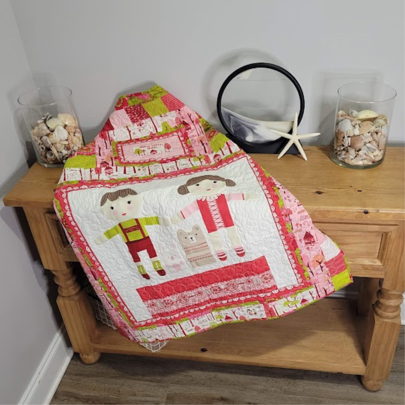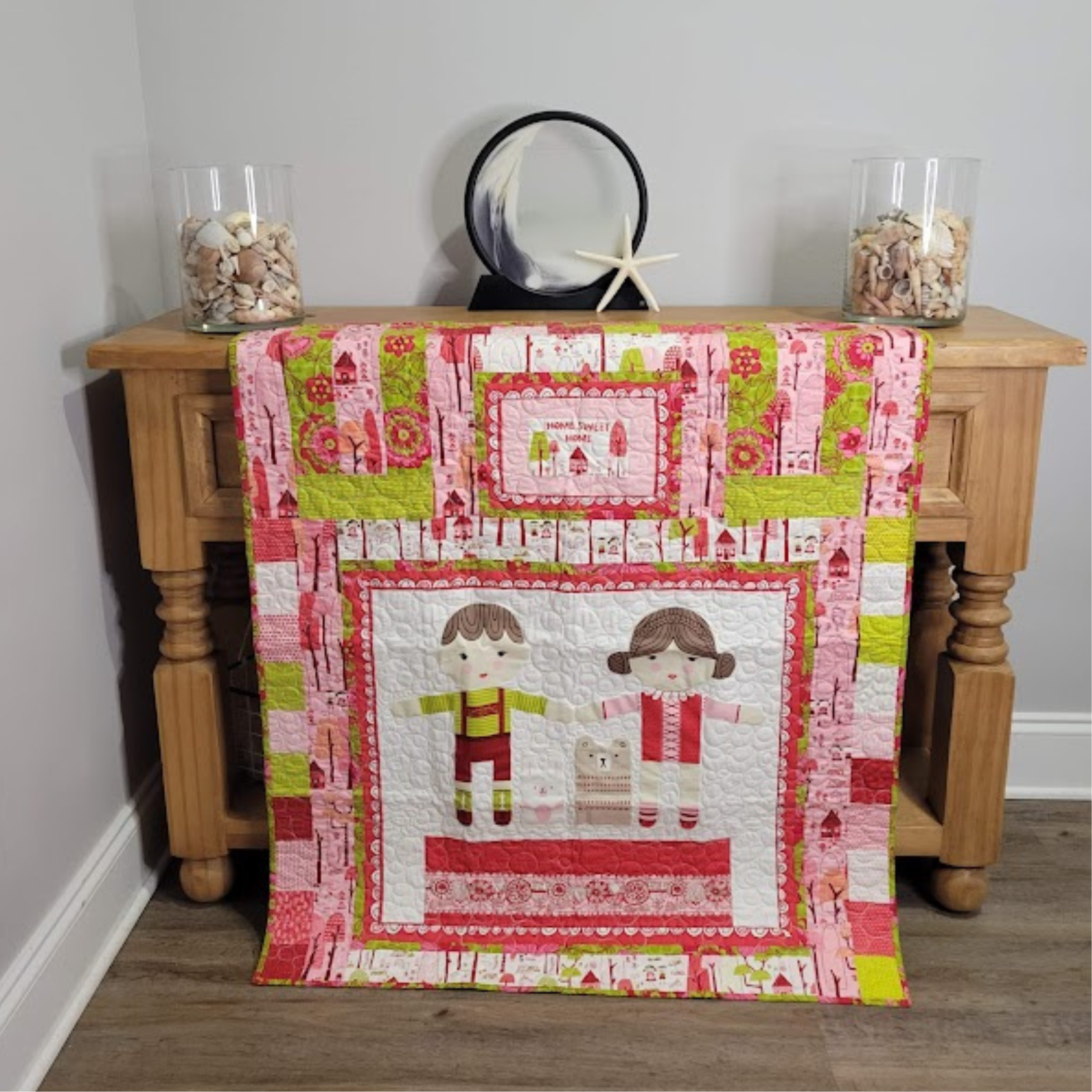 Cute little wall hanging or baby quilt, would look wonderful in a nursery decorating the wall. Its in pinks, reds,greens and white. Quilted by myself in my quilt studio by outlining the main figures in the center with the backside of the figures on the back of the quilt. The rest is quilted in circles inside of circles. It measures approximately 33x39 inches.
