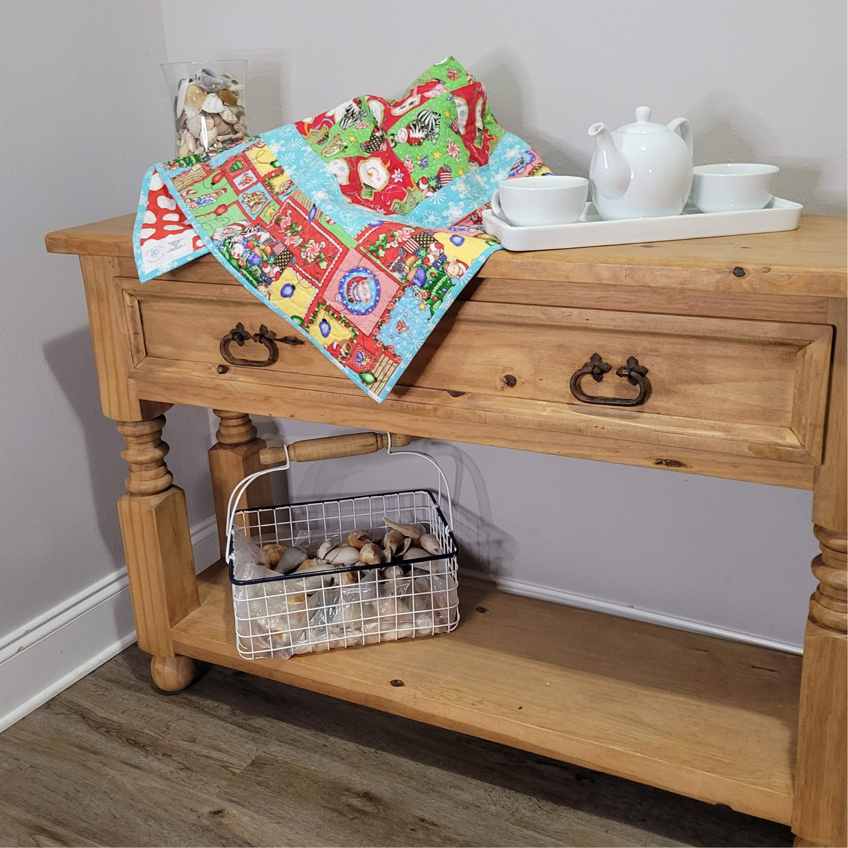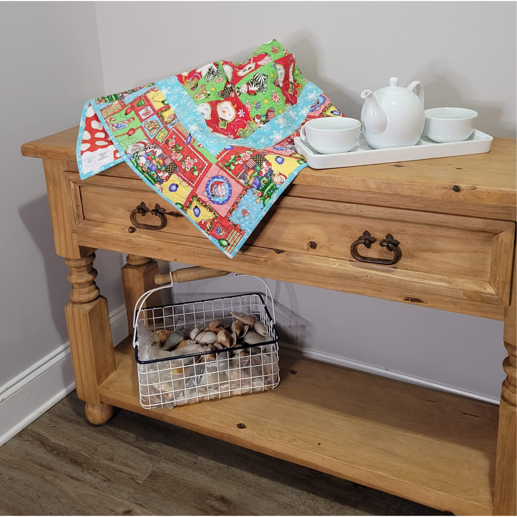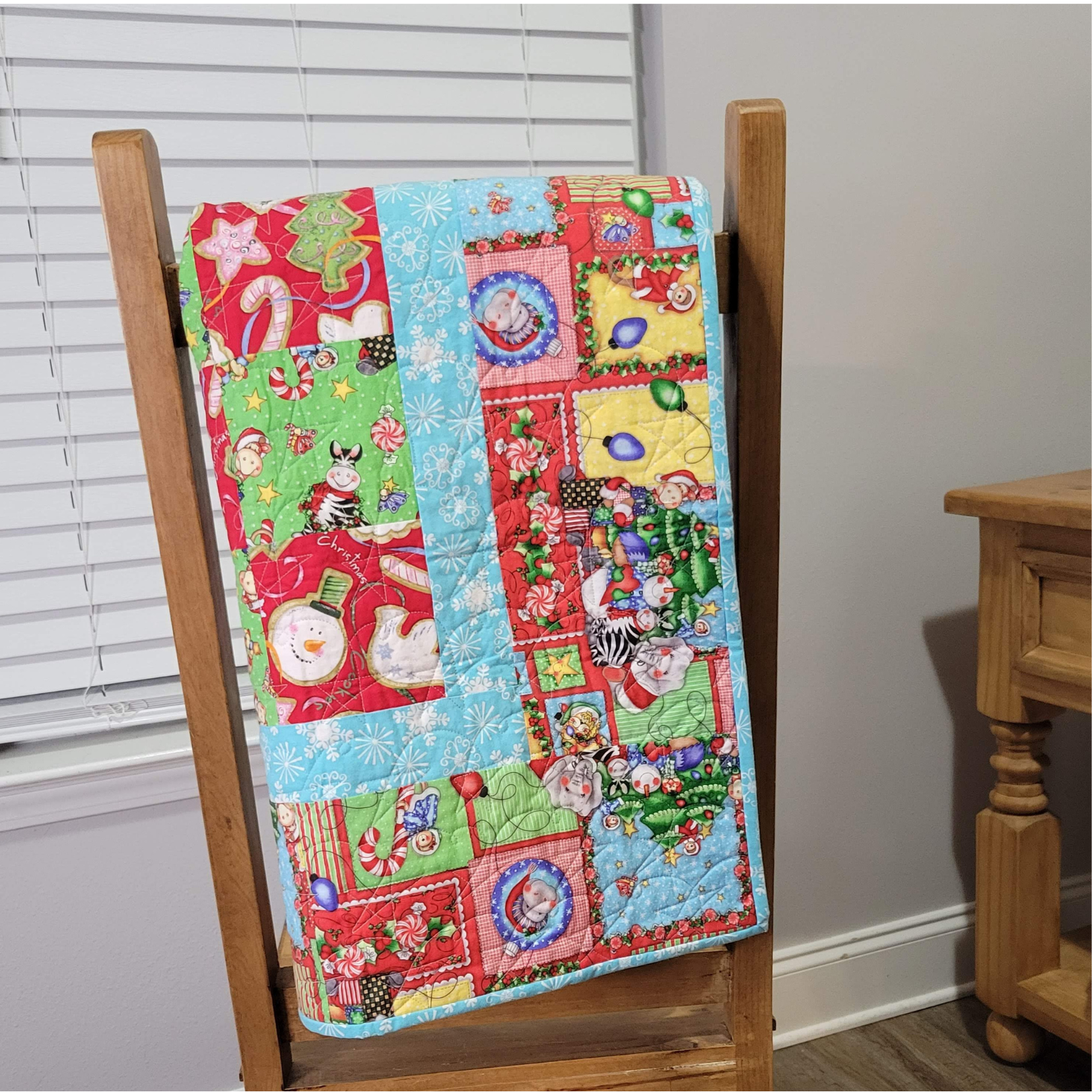 This quilt would look beautiful as a decoration on your wall or inviting when tossed on a chair. It measures 47"x 47". Multi-colored with mostly reds, greens and blues with fun animal prints throughout, made of 100% cotton and free motion quilted by myself in my quilting studio with edge to edge stars.